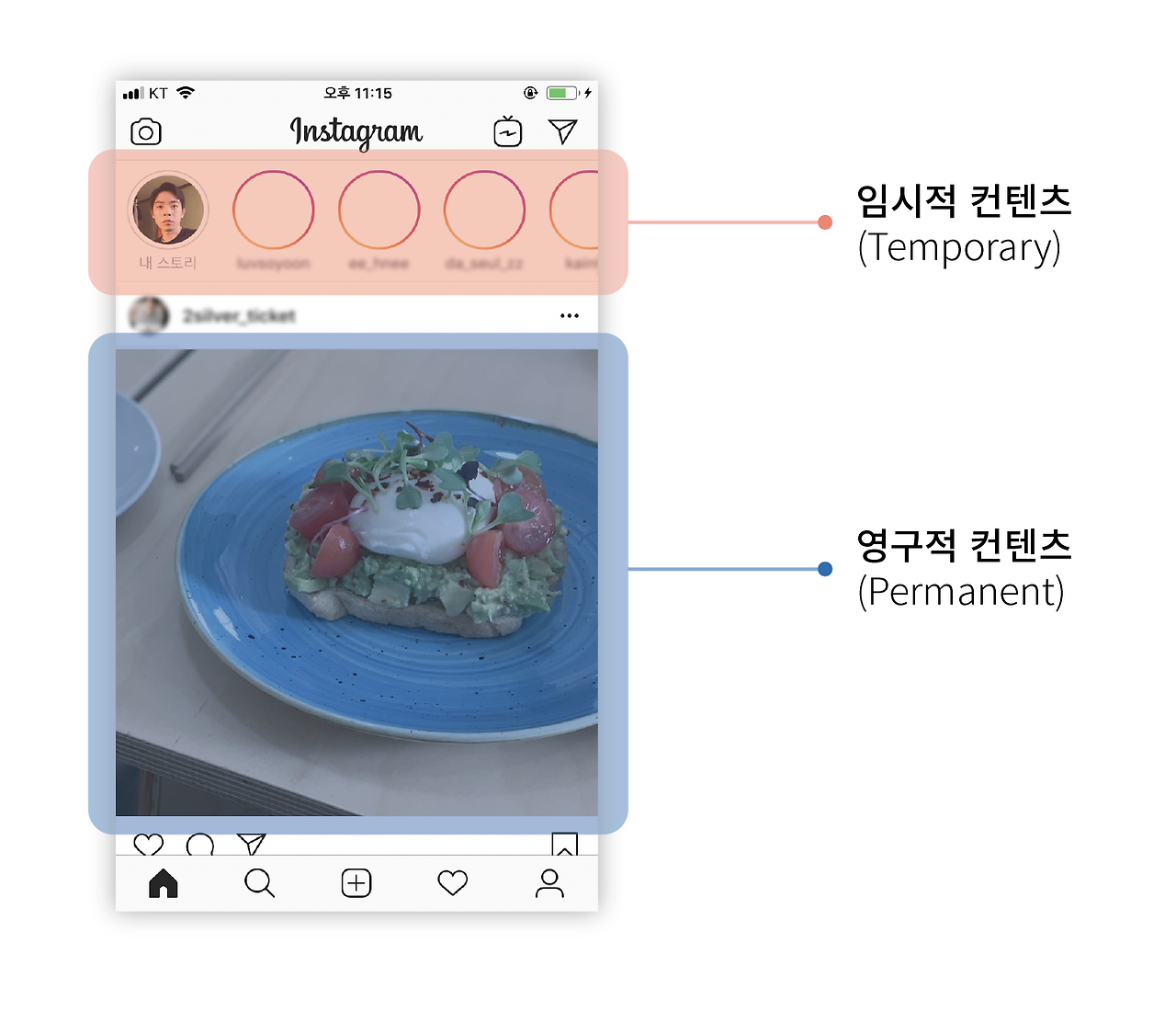 인스타그램의 컨텐츠는 임시적인 컨텐츠와 영구적인 컨텐츠로 크게 두 분류로 나뉜다고 볼 수 있다. 임시적인 컨텐츠, 즉 업로드 후에 시간이 지나 자동으로 삭제되는 컨텐츠이며, 영구적인 컨텐츠는 사용자가 직접 삭제하지 않는 한 없어지지 않는 컨텐츠를 의미한다. 초기 인스타그램만 하더라도 임시적인 컨텐츠의 개념은 존재하지 않았고 영구적인 컨텐츠만 존재했었다. 인스타그램 스토리가 처음 나왔을 때 사람들이 이 기능을 쓸까 싶었다. 추억을 사진으로 기록하는 인스타그램에서 기록되지 않는 컨텐츠라니! 하지만 이런 임시적인 요소가 사람의 심리를 건드릴 줄은 누가 알았을까?