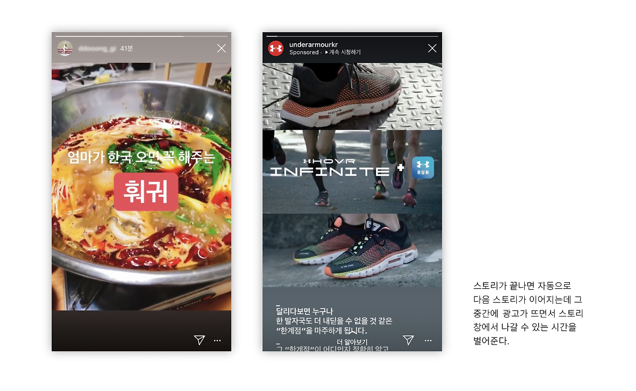 스토리를 다 읽으면 자동으로 다음 사람의 스토리가 이어진다. 음? 다음 게시물이 누구의 게시물 인지도 모르는데 그러다 내가 읽었다는 기록이 남게 되면? 사실 이 문제를 해결할 수 있는 방법은 많다. 보고 있는 스토리의 재생이 끝나기 전에 다음에 보일 게시물에 대한 피드백을 해 줄 수도 있지 않은가? 하지만 얍삽한(?) 인스타그램은 여기서 광고를 이용한다. 정말 광고가 나오는데 묘하게 기분이 나쁘지않고 심지어 도움마저 된다. 사람의 심리로 발생하는 워크어라운드(workaround)를 전략적으로 이용해 수익을 창출하는 인스타그램에게 박수를 쳐주고 싶다...