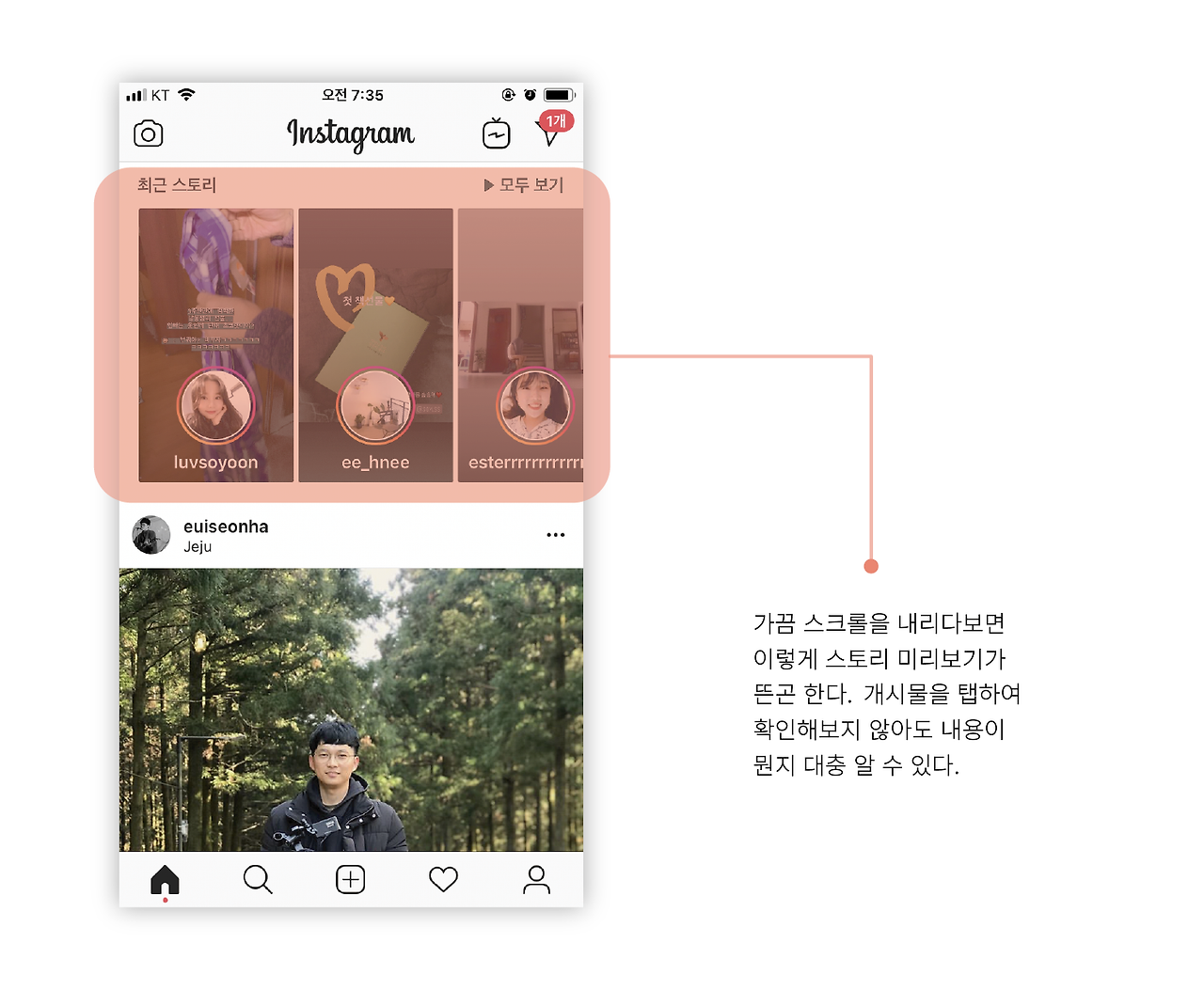 그래도 궁금한 건 어쩔 수 없지 않은가! 그들의 이런 알다가도 모를 심리를 해결해주기 위해 인스타그램은 친절하게도 스토리 미리보기라는 기능을 추가해 주었다. 가끔 밑으로 스크롤을 하다 보면 스토리 미리보기가 뜨곤 하는데, 이걸 보면 굳이 게시물을 탭 하지 않아도 게시물의 내용이 뭔지 알 수 있다. 어쩌면 이런 게 사람의 '교묘한' 심리로 발생하는 워크어라운드(workaround)가 아닐까?