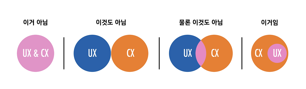 정리를 해보자. UX와 CX는 다르다. 그렇다고 이 둘을 완전히 구분 지어서도 안된다. 물론 공통된 면모가 있기는 하다만 CX가 UX보다 다루는 영역에 있어서 더 포괄적이다 보니 UX는 CX의 부분집합이다 라고 해석하는 게 맞다고 본다.