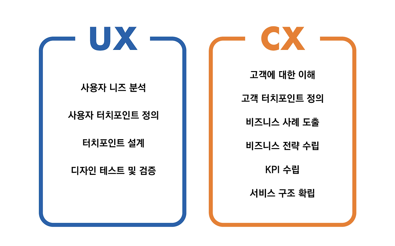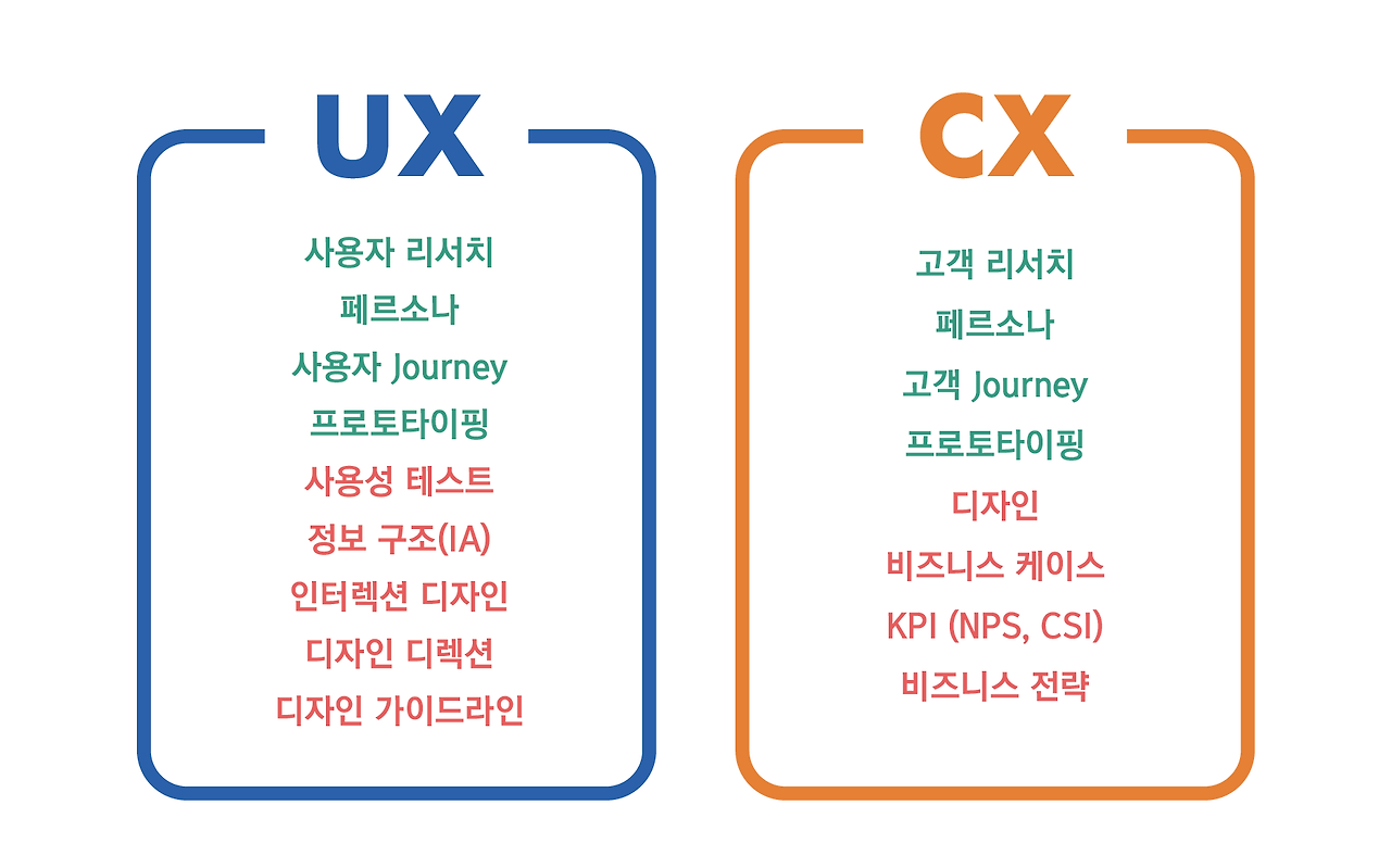 UX는 사용자의 니즈를 분석하고, 터치포인트를 정의 및 설계하여 디자인을 테스트하고 검증하는 과정을 거친다. CX는 제품/서비스에만 국한되지 않고 고객의 전반적인 라이프스타일을 이해하는데 시작해 최종적으로 고객의 니즈를 통해 비즈니스 모델을 개선 및 제시하는 것이라 볼 수 있다(요약하자면 돈이다).