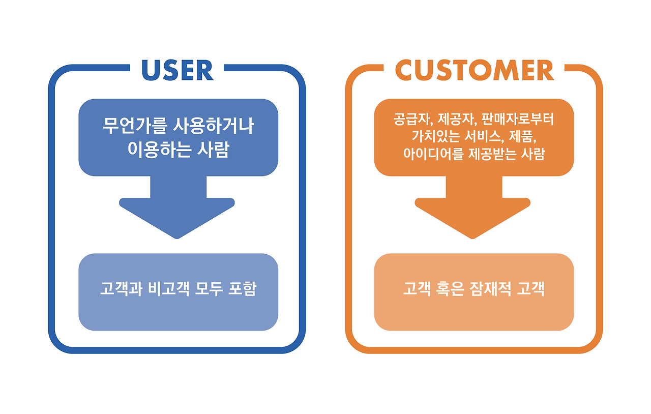 그렇다면 사용자(User)와 고객(Customer)의 차이는 무엇일까? 언뜻 보면 비슷하지만 사용자는 무언가를 사용하거나 이용*하는 사람이다. 즉 고객을 넘어 비고객까지 포함하는 개념을 말한다. 반면 고객은 공급자, 제공자, 판매자로부터 가치 있는 서비스, 제품, 아이디어를 제공받는 사람이다. 이미 서비스 공급자와 고객 간의 관계가 형성된 것이 전제이므로 고객 혹은 잠재적 고객만을 포함한다.