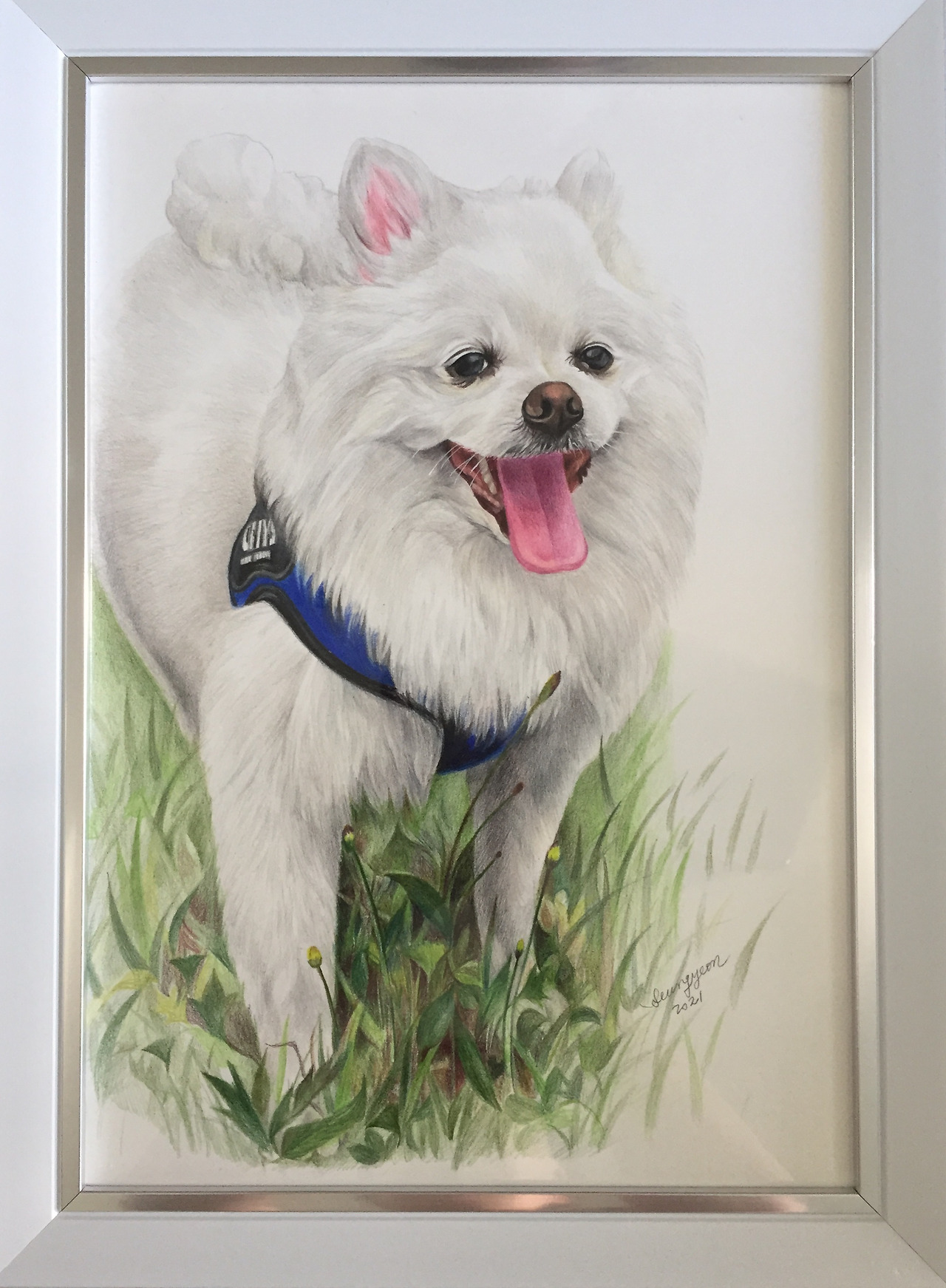 액자 틀은 맑음이의 맑고 깨끗한 이미지를 강조해 보고자 일부러 같은 흰색을 선택했는데 결과는 만족스러웠다. 견주님도 맑음이의 초상화를 받으시고 많이 좋아해 주셔서 개인적으로 보람된 작업이었다!
