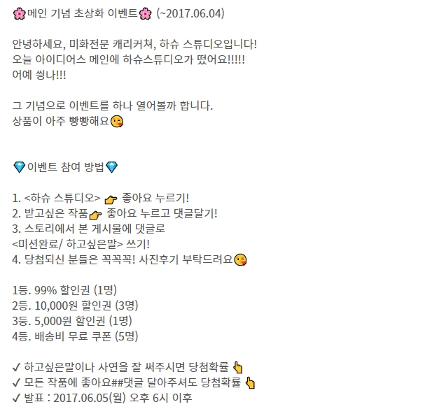 메인에 뜬 게 신나서 스토리에 이벤트를 열었다. (너무 신났던 게 잘 보이는 게시글인 것 같다 ㅋㅋㅋㅋ) 댓글로 하고싶은 말을 써주면 그 중 추첨을 통해 99%할인쿠폰 등을 주는 이벤트였다. 이 때 댓글 반응들을 잊지 못한다.