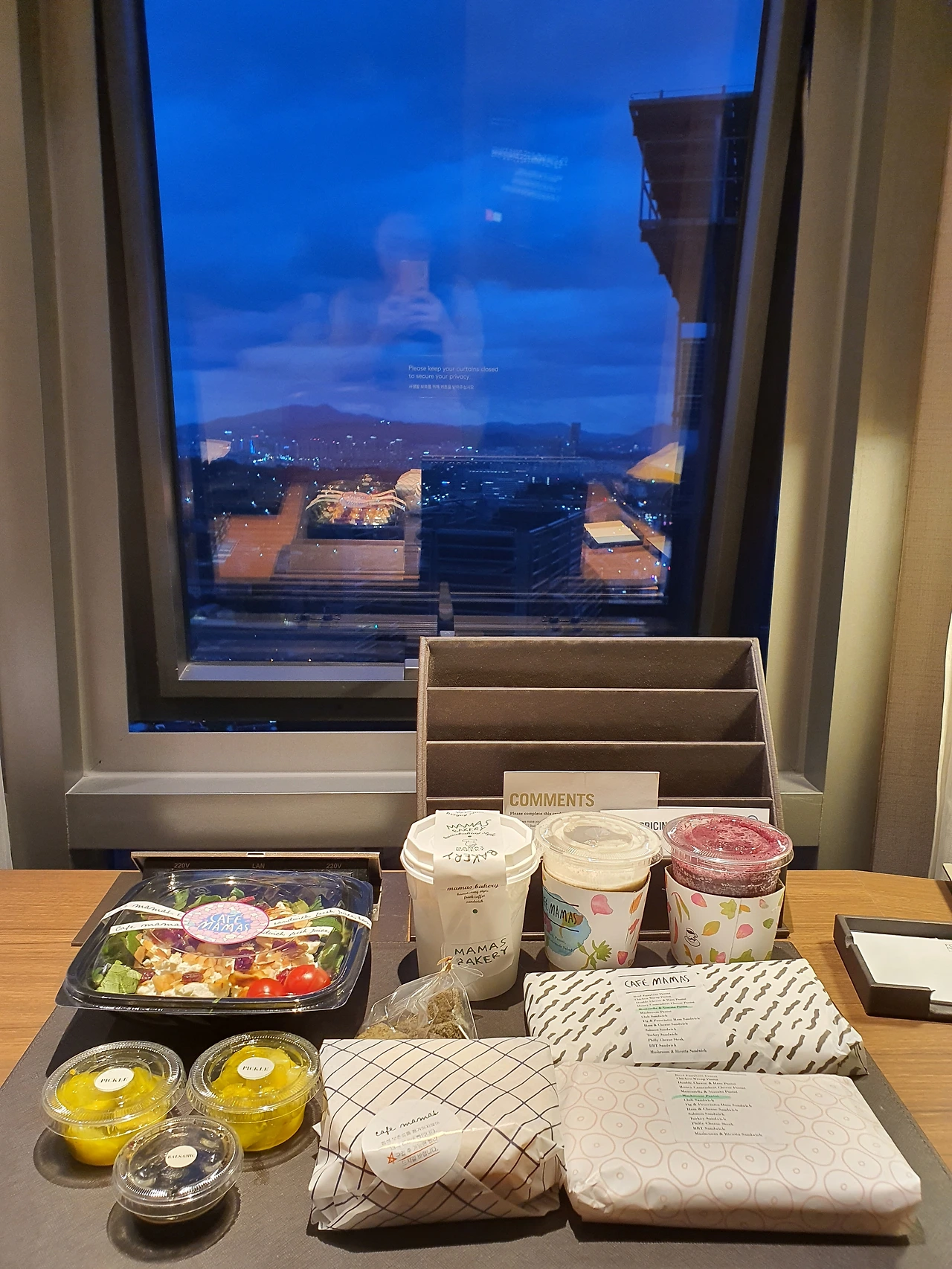 코로나 특별 할인 룸서비스도 하고 있었다. 그렇지만, 남편이 밖에서 맛있는 음식들을 사 와서 함께 먹었다.