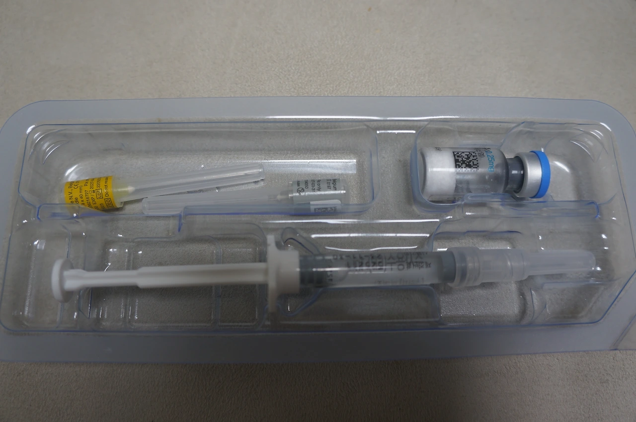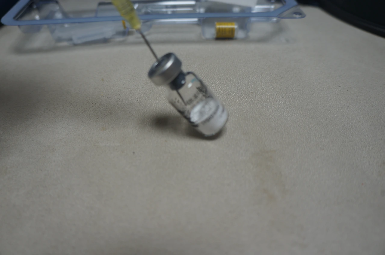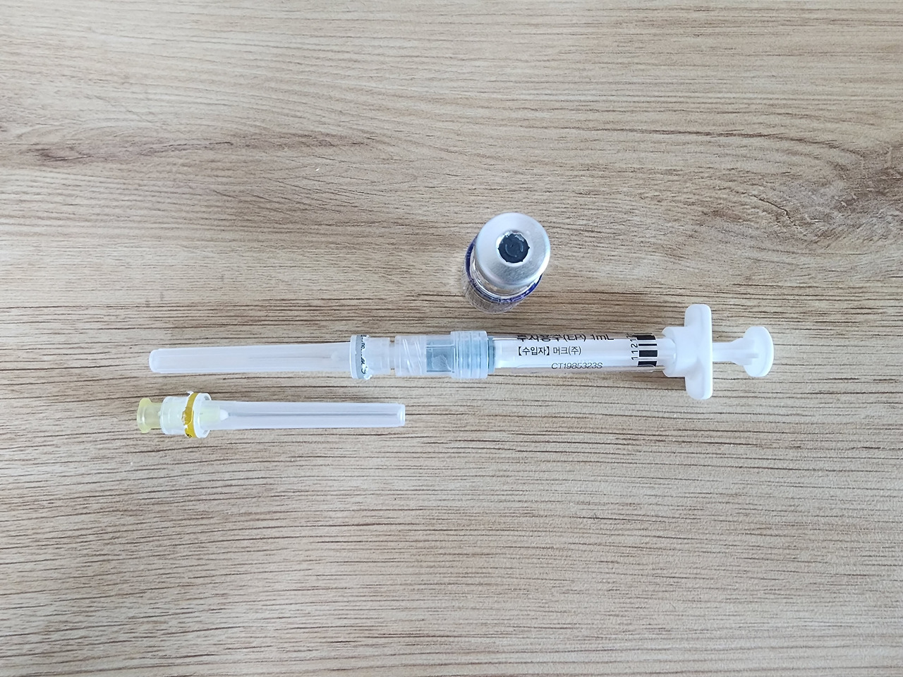 먼저 하얀 가루가 있는 유리병 안에 주사액을 투입한 후 섞는다. 유리병의 뚜껑은 고무로 되어있어서 두꺼운 주삿바늘이 들어간다. 그리고 하얀 가루와 주사액을 바늘을 꽂은 채로 흔들어서 섞어준다. 꽤나 잘 섞여서 좀만 흔들면 하얀 가루가 다 없어진다. 그리고 그 주삿바늘로 주사액을 빨아들인다.