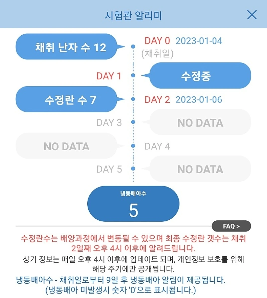 7개의 수정란 중 5일 동안 곱게곱게 정성 들여서 키워서 5개나 살렸다. 배양 과정에서 얼마나 오염이 잘 나고 얼마나 잘 죽는지 모른다. 내가 메이저 난임병원을 선택한 이유 중 하나는 연구원 입장에서 생각했을 때, 실력 있는 연구원들이 더 메이저 병원에서 많이 일할 것 같았다. 의사 선생님의 실력도 중요하지만, 난자채취 과정이 힘든 만큼 채취된 난자를 잘 배양하는 연구원들의 역량도 매우 중요하다고 생각한다. 나는 동결배아 개수에 대 만족한다.