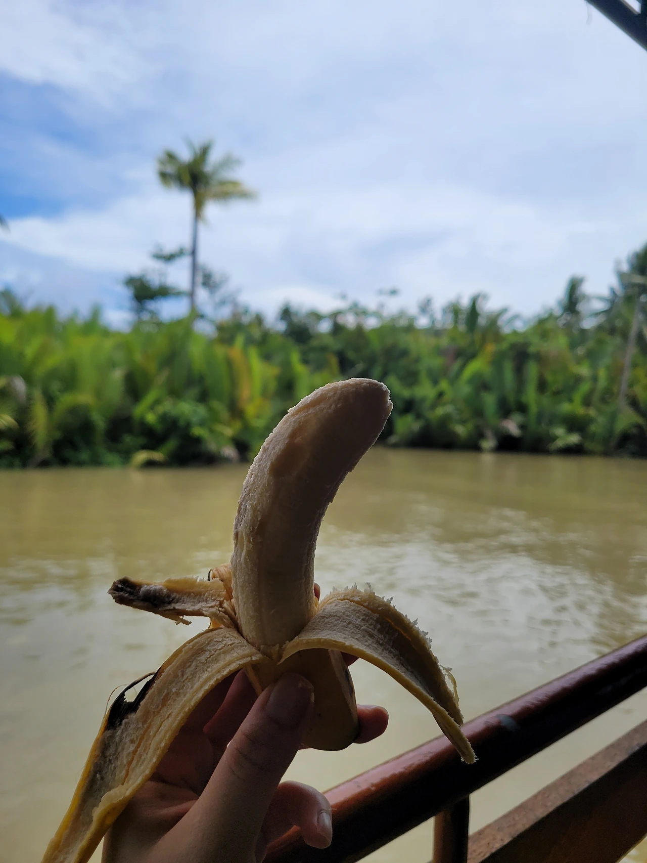 그때쯤 돼서는 크루즈에 탄 모두가 음식을 덜러 와서 줄을 서고 있었기 때문에 테이블에 돌아와서 처음에 덜어왔던 음식을 먹었다. 덜어온 음식을 조금 먹고 초록색 강을 바라보았다. 어느 정도 사람들이 빠졌을 때 다시 음식을 가지러 갔다. 동남아여행에서 빼놓을 수 없는 건 바로 과일이다. 노란색 바나나와 빨간색 수박을 덜었다. 바나나의 노란 껍질을 까니 속살도 노란색이었다. 수박은 조금 심심한 맛이었는데, 많이 달지 않고 심심한 맛이 좋았다. 한국에서 먹던 바나나와 수박과는 한끝이 다른 맛이었다.