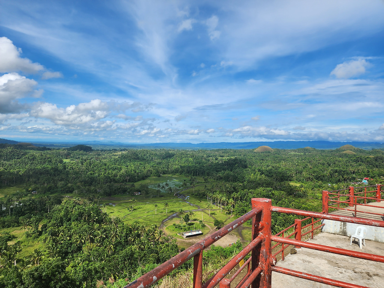 담당 한국인 가이드와 현지인 가이드들은 이미 초콜릿힐을 많이 봐서 아무런 감흥이 없나 보다. 우리를 내려주고 다시 버스에 탔다. 우리는 전망대를 올랐다. 214개로 이루어진 계단 중간중간에 쉬는 곳도 있었고, 딱 봐도 그리 많이 걷지는 않아도 됐다. 등산할 준비를 했던 나는 매우 허무해졌지만, 더 손쉽게 갈 수 있다는 생각에 '이 정도는 껌이지.'라는 생각으로 계단을 오르기 시작했다. 계단은 두세 명 정도 가로로 서면 차는 정도의 너비를 지니고 있었다. 오를 때는 오른쪽으로 줄지어서 올라갔다. 전망대를 두르고 펼쳐진 초콜릿힐은 장관이었다.