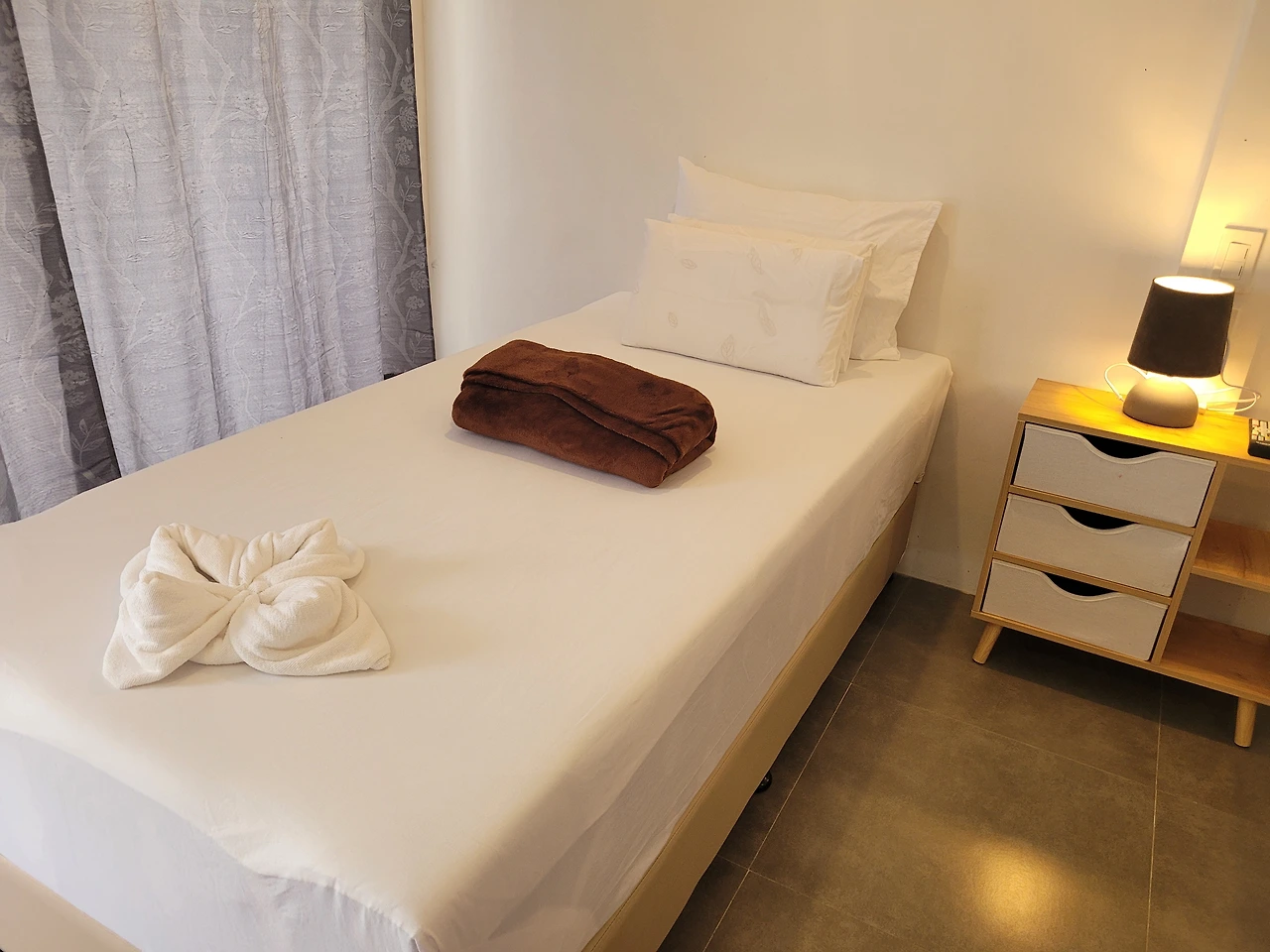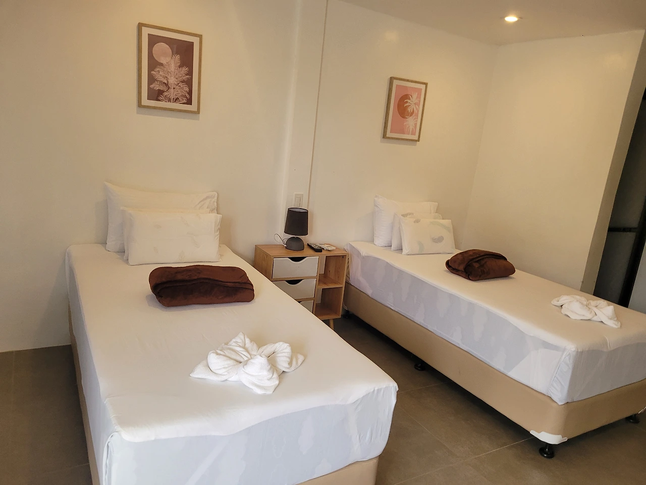 방으로 들어가니 하얀 싱글침대 두 개 위에 예술적으로 접어진 수건이 올려져 있었다.
