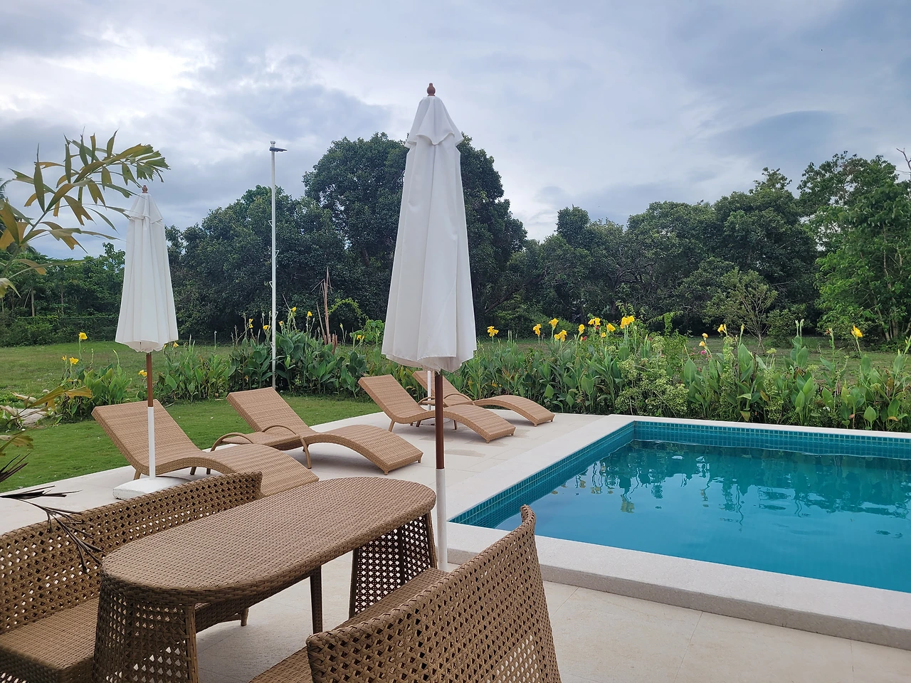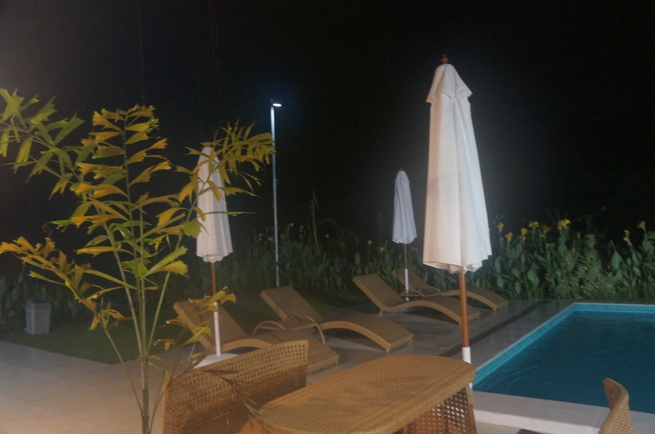 수영장에는 라탄으로 된 선베드와 파라솔이 설치된 테이블이 있었다. 테이블 위에 졸리비에서 사 온 치킨과 스파게티를 세팅하니 제법 그럴듯했다.