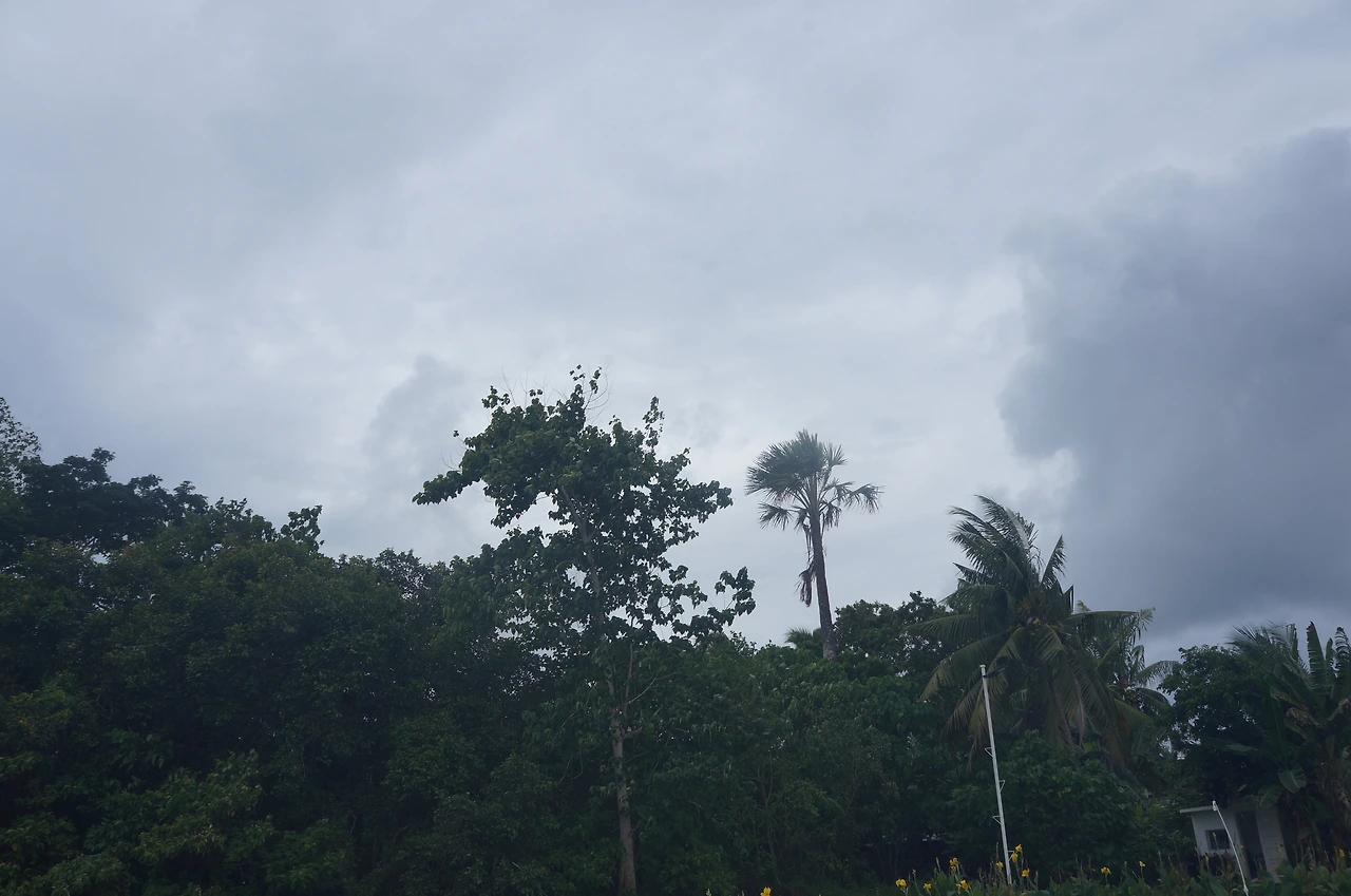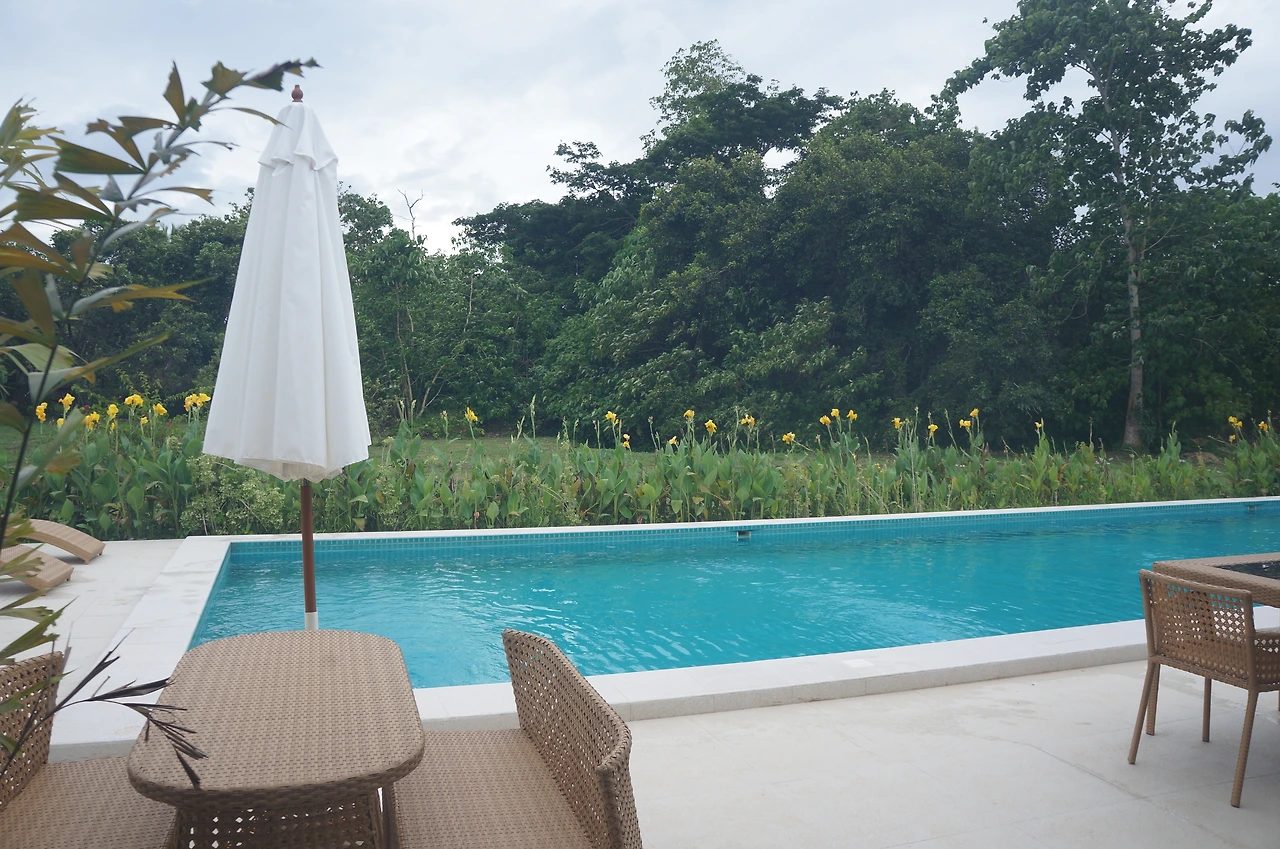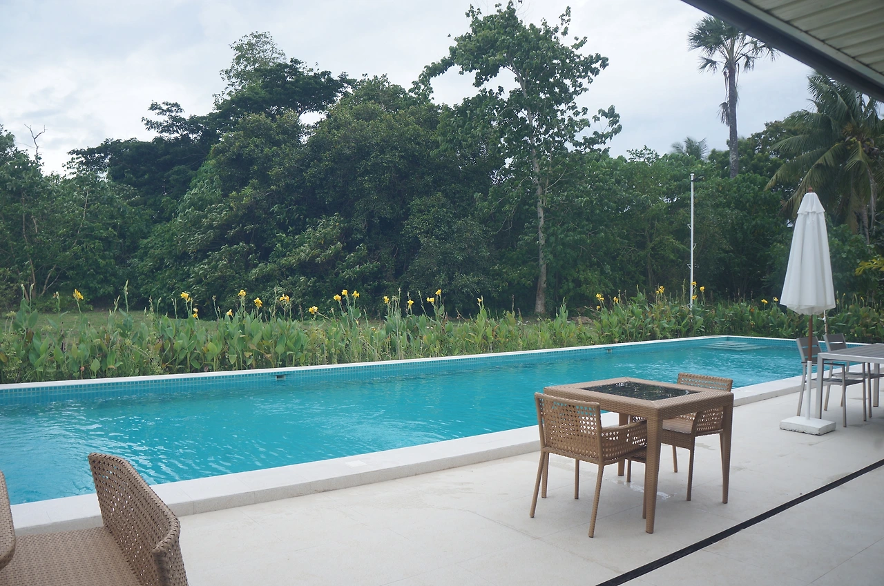 커튼을 다 젖히면 바로 수영장이 보였다. 방으로 들어가는 문 위로는 처마처럼 지붕이 튀어나와 있어서 비와 햇빛을 조금이나마 막아줄 수 있었다. 남편은 바로 수영복으로 갈아입고 수영장으로 뛰어들었다. 나는 선베드에 누워서 수영하는 남편을 바라보며 이 여유를 한껏 즐겼다. 파란 수영장 위로는 하늘이 보였는데, 그 하늘은 한국에서는 보기 힘든 날카롭고 긴 이파리로 가려져 있었다. 내 눈이 보는 모습이 사진의 한 장면 같았다.