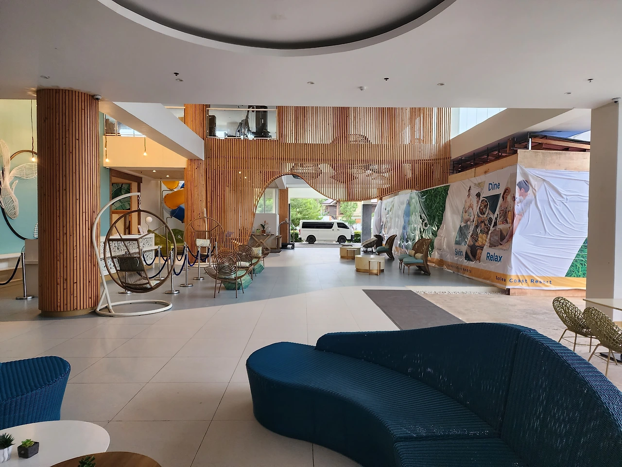 리조트 로비에는 레시가드를 입은 많은 한국인 투숙객들이 우리 부부처럼 가이드를 기다리고 있었다. 태풍이 심해서 배를 구하는데 어려움이 있어서 시간이 지체되었지만 빨간색 지프가 도착했다. 차 안에는 여러 명이 타고 있었고, 첫날 호핑투어만 할 거라고 말했던 팀도 있었다. 그렇게 지프차는 해변에 도착했다. 가이드는 파도가 심해서 바다에 나가지 않는 배들이 많아서 다른 배를 구했다고 했다.