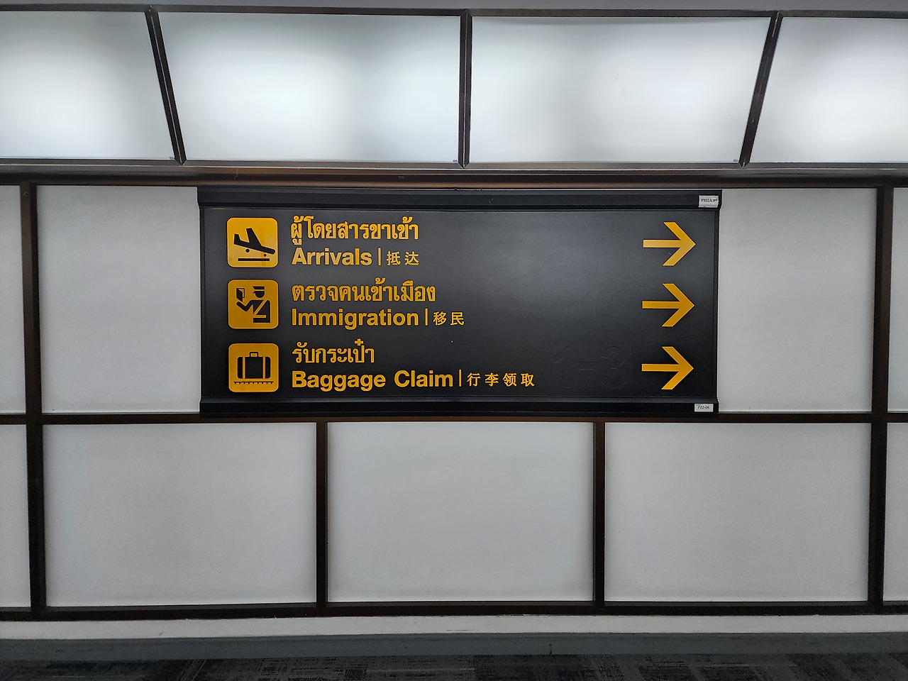 우리가 탄 비행기는 돈므항 공항에 도착했다. 태국 문자가 익숙하지 않아서 태국 글자를 보면서 천천히 걸었다. 걷다가 입국심사를 하는데 대기하는 사람들이 많이 있었다. 세계적으로 유명한 관광도시 방콕답게 각 나라에서 온 관광객들로 가득했다. 방콕에는 두 개의 공항이 있다. 수안나폼공항이 더 최근에 생기고 큰 공항이고, 돈므항 공항은 국내선도 다니는 작은 공항이라고 해서 이렇게까지 대기인원이 많을 줄 몰랐다. 밤비행기로 도착하는 사람들이 이렇게나 많다니.