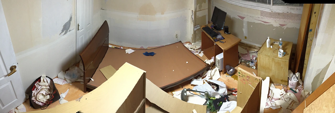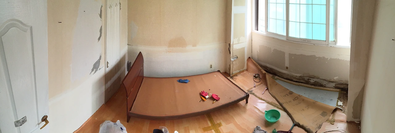 문득 너덜너덜 떨어진 벽지, 베란다 확장 부실 공사로 여기저기 찢어진 장판 등
