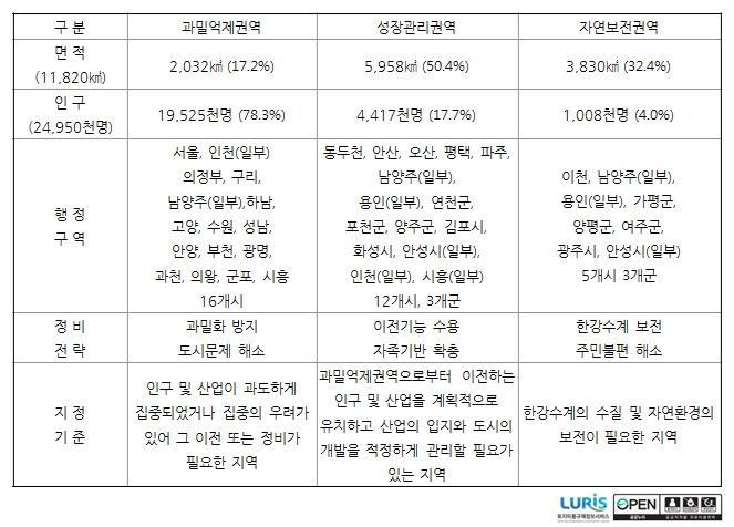 수도권의 인구와 산업을 적정하게 배치하기 위하여 수도권을 다음과 같이 과밀억제권역, 성장관리권역 및 자연보전권역의 3개 권역으로 구분하고 권역 특성별로 인구집중 유발시설과 대규모 개발사업의 입지에 대한 차등규제를 실시하고 있다.