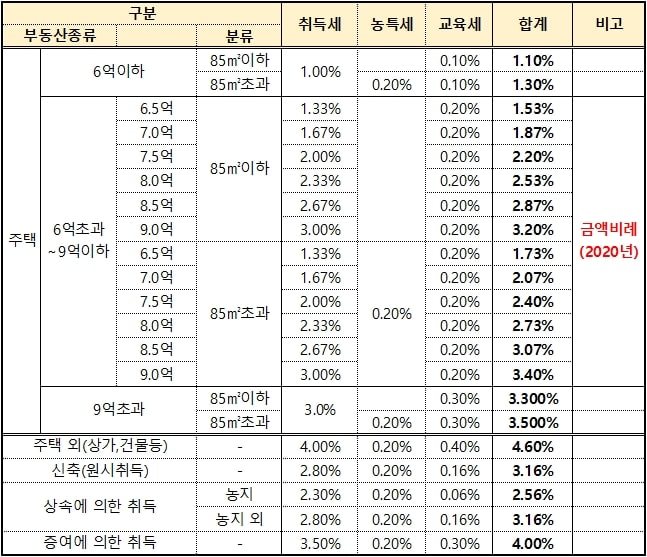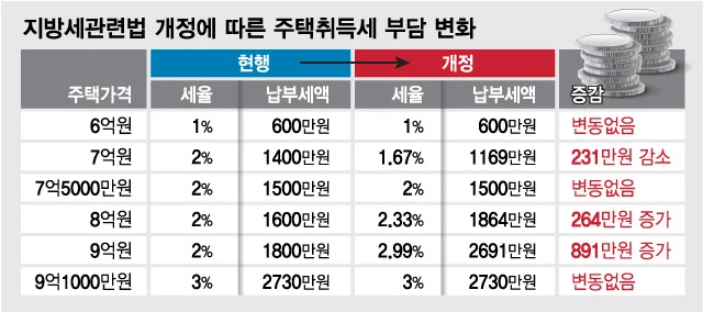 취득세는 6억과 9억 원 기준, 전용면적 85㎡ 기준으로 세율이 변경된다.