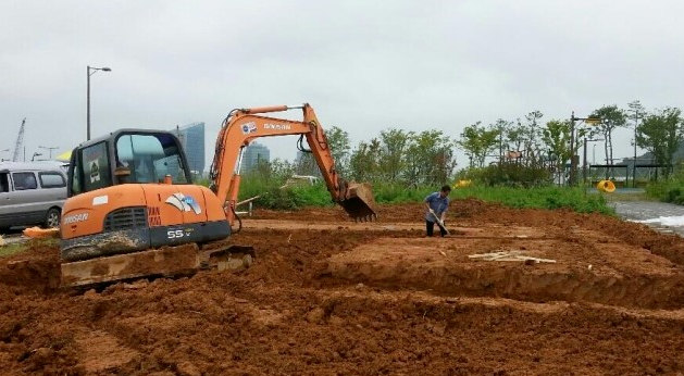 건축물의 기초를 구축하기 위해 지면의 흙을 파내는 과정을 터파기라고 합니다. 보통 700~800mm 깊이로 터파기를 하는데 건물의 크기와 토질의 상태에 따라 깊이는 달라질 수 있습니다. 터파기를 할 때 발생하는 토사는 일부는 반출하고 일부는 되메우기를 하는 데 사용합니다.