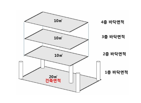 건축면적은 전체 건축물에 대해서 해당되고, 바닥면적은 건축물의 각 층에 한해 적용되는 차이가 있습니다.