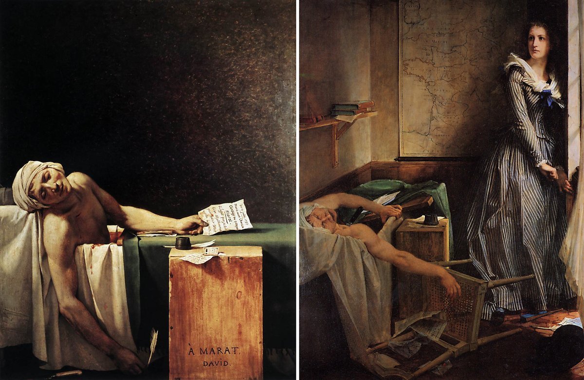 프랑스혁명으로 승승장구하던 다비드였지만, 왕정 이후의 국민공회 내에서 평민의 기본권을 주장하는 자코뱅파와 경제적 자유를 중요하게 생각하는 지롱드파가 부딪히게 됩니다. 지금으로 따지자면 급진 좌파와 온건 우파의 싸움이었습니다. 자크루이 다비드는 그림의 주인공인 장 폴 마라와 함께 자코뱅파였습니다. 자코뱅파는 그 유명한 공포정치를 이끈 로베스 피에르가 이끌었지요. 당연히 지롱드파 일원들이 무수히 죽습니다. 이에 지롱드파 일원이던 샤를로테 코르데가 동료들의 죽음에 대한 복수로서 마라를 암살하게 되지요. 이게 바로 <마라의 죽음> 탄생 배경입니다.
