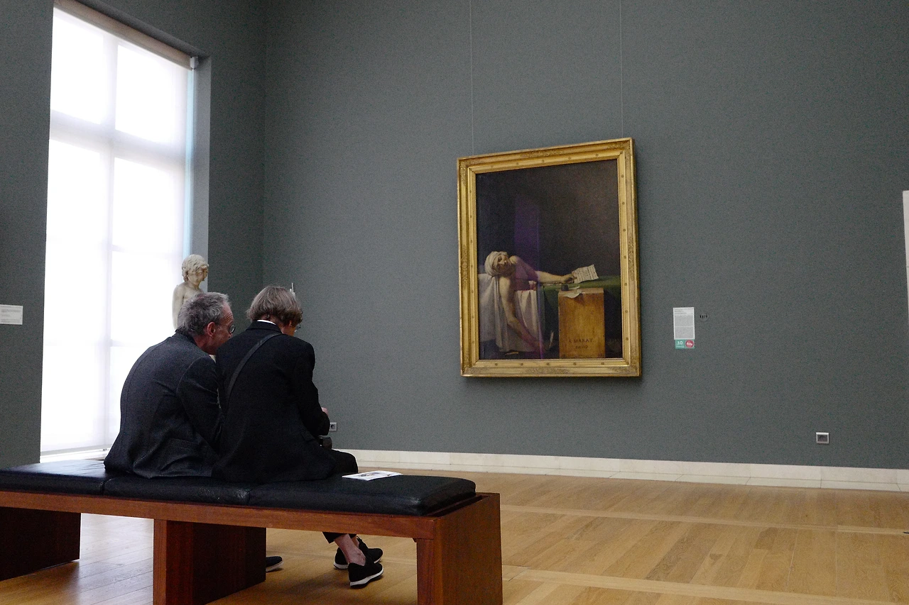 벨기에 왕립미술관에서 실제로 이 작품을 봤었을 때 무척 신기했습니다. <마라의 죽음>은 어느 미술사 책에서도 빠진 적이 없을 만큼 유명한 작품인데, 한쪽 벽면에 덩그러니 걸린 게 묘하게 다가왔지요. 이처럼 미술사적으로 중요한 작품이지만, 아무런 정보도 없는 어린아이에게 <마라의 죽음>을 보고 느낀 게 무엇이냐고 묻는다면, 아마 그냥 “사람이 편지를 쓰다 잠들었나 봐요”, 좀 더 자세히 본 친구는 “저 사람이 죽었나 봐요” 정도로 말할 겁니다.