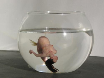 <Mermaid>는 <공간 사옥>에 전시된 작품입니다. 이동욱 화가는 특수한 재료를 이용하여 손가락 만한 인간의 나체를 가감 없이 표현하는 것으로 유명합니다. 섬뜩한 작품도 있지만 그의 작품 형태는 나체의 인간과 그를 둘러싼 환경을 효과적으로 드러내기 위한 수단인 경우가 많습니다. 가령 통조림 캔 속에 절여진 인간, 벌집 속 꿀에 함뿍 적셔진 소녀처럼 말이지요.