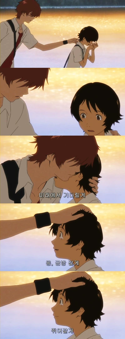 그래서 마코토는 치아키를 위해 결정한다. 자신이 울어버릴 일인데도. 이제 시간을 되돌리는 게 얼마나 본인에게도, 다른 사람에게도 잔인하고 아플 수 있는 일인지 마코토는 알고 있다. 어쩌면 치아키의 그 고백, 마코토 모르게 치아키도 꽤 여러번 고백했다가 없었던 일로 만들었을지도 모른다. 소중한 친구 고스케가 이미 여러 번 죽을 운명이었던 것을 구해주었던 것을 마코토가 몰랐듯이. 아무도 모르는데 나만 감당해야하는 괴로움을 알기에 마코토는 좋아하는 치아키가 더 이상 시간을 오가게 하고 싶지 않았을 것이다. 그에게는 현재이자 마코토에게는 미래인 그 시간에서 치아키가 행복하길 바라기에, 그가 좋아하는 그림이 온전히 전해질 수 있게 여기 남아 그가 그의 시간에서 행복할 수 있게 하는 것. 그리고 더 멋진 사람이 되어 치아키를 찾아가는 게 그녀가 내린 결론일 것이다. 그렇게 치아키는 미래에서 마코토를 기다리고 마코토는 현재에서 치아키에게 달려간다.