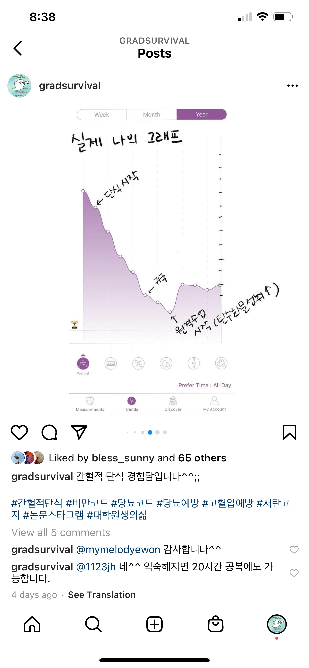 4. 혈당측정기를 사서 재보니 16시간 동안 단식을 해도 혈당이 100 이상이었다. 전당뇨질환이 나에게도 있다는 것은 정말 충격이었다. 이대로 두면 몇 년 이내로 당뇨가 되는 것이었다. 혈당 측정을 하며 단식 시간을 18시간으로 늘려보았다. 16시간이 지나야만 혈당이 100 이하로 내려갔다. 식사 시간을 12시에서 6시로 한정지었다. 6시간 내내 먹었다. 하지만 이젠 탄수화물은 많이 줄였다. 몸무게가 쭉쭉 내려가기 시작했다.