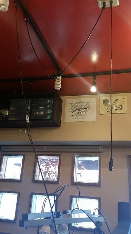 1인 타투샵으로 운영되고 있었는데 규모는 작지만 그의 손길 하나하나가 담긴 인테리어가 인상적이었다. 스튜디오는 전체적으로 붉은색과 흰색으로 이루어져 있었다. 직접 만들어 낸 가구와 페인팅, 역사가 묻어나는 소품들로 구성되어 그의 세계로 들어가는 듯한 느낌을 준다. 심지어 작업대와 베드도 직접 제작한 것이었고 모든 전기선들은 동선에 방해되지 않게 천장으로 향해 있었다.