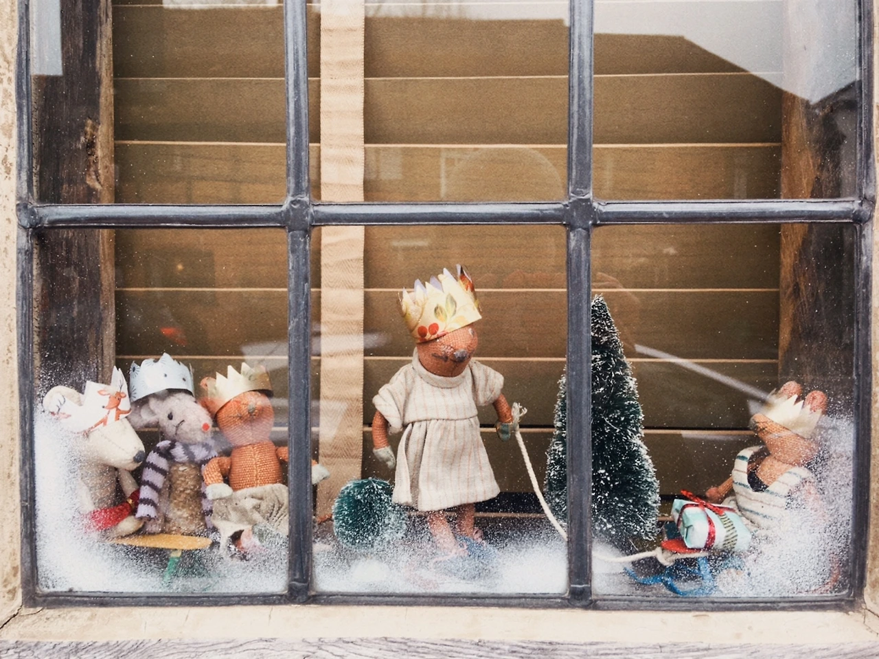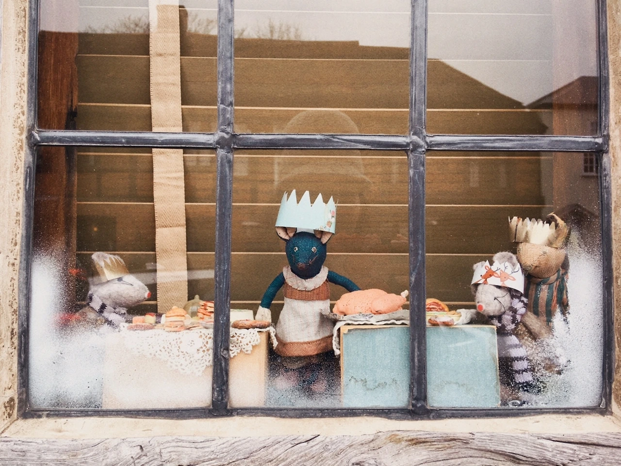 영국에는 성탄절 만찬을 먹으며 온 가족이 크리스마스 크래커(Christmas cracker)라는 폭죽을 함께 터뜨리는 풍습이 있다. 길쭉한 알사탕 껍질같이 생긴 크리스마스 크래커를 양팔을 교차해 옆사람과 한쪽씩 힘껏 잡아당기면 펑~ 소리가 나면서 선물이 쏟아진다. 사실 선물이라 하기엔 민망한 예쁜 쓰레기와 아재 개그나 난센스 퀴즈가 뒤섞인 쪽지, 그리고 얇은 습자지로 만든 왕관이 내용물의 전부다. 성탄쥐들이 쓰고 있는 왕관이 바로 크리스마스 크래커용 선물이라 창가 풍경을 통해 영국 최대 명절의 정수를 맛본 셈. 과연 우리 동네 최고 스토리텔러다운 깜찍한 크리스마스 전시회다.