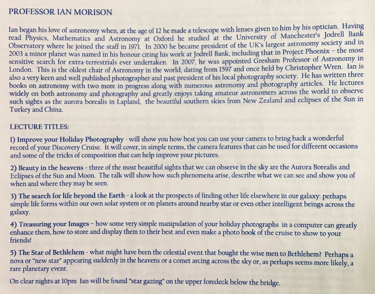 세계적인 천문학자 이안 모리슨(Ian Morison)과 함께 밤 10시가 되면 따끈한 홍차 한 잔을 들고 포근한 극세사 점퍼를 걸친 채 크루즈 맨 꼭대기 야외 데크에서 밤하늘의 별들을 보며 산책하던 날들도 잊지 못할 추억으로 남아 있다. 자신의 이름으로 명명된 소행성이 있을 정도로 천문학계에서 명성이 높은 석학인 그는 사진에도 조예가 깊어서 강연 일정에 특별히 '크루즈 여행 사진을 잘 찍는 법'에 대해서도 알기 쉽게 다뤄주었다. 그와 함께 흑연같이 깜깜한 하늘의 별을 헤던 크루즈 밤 기행의 추억은 그 밤하늘에 콕콕 박혀 빛나던 별들만큼이나 소중하다.