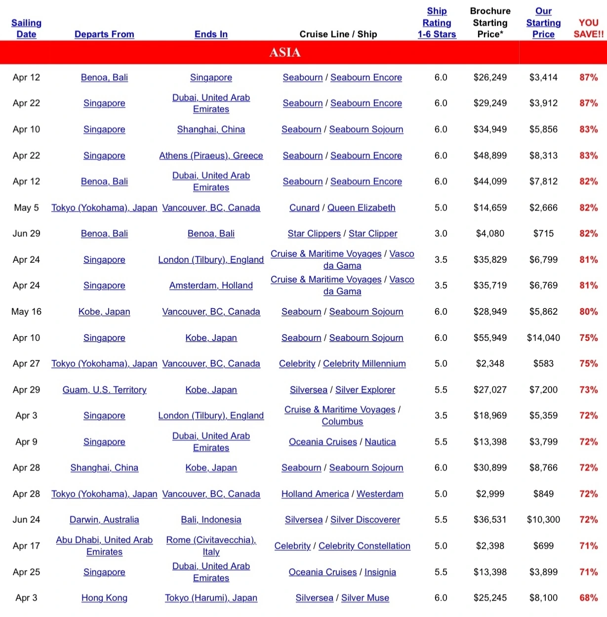 지갑은 얇지만 시간 부자인 내가 크루즈 여행을 검색할 때 일 순위로 찾는 정보는 바로 크루즈 가격이다. 각 크루즈 선사의 홈페이지에서 할인 상품을 검색할 수도 있지만, 가장 선호하는 방법은 다양한 크루즈사의 상품들을 비교검색을 할 수 있게 한 사이트에서 최고 할인율을 찾는 방법이다. 이때, 할인율은 80%가 넘어도 크루즈 등급이 5성급 이상으로 높으면 오히려 할인율이 50% 이하인 3성급 크루즈보다 가격이 높을 수도 있으니 할인율과 최종가를 함께 살펴봐야 한다.