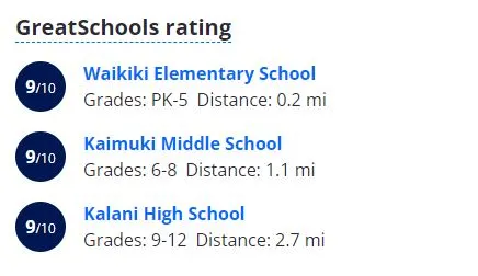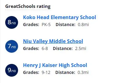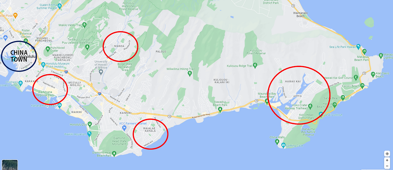 아이들과 함께 거주하기에 좋은 지역 첫 번째로는 하와이 카이 지역과 카할라 지역이 있다. 두 지역의 특징이 비슷한데 호놀룰루 전체에서 부촌에 해당되며 치안이 좋고 학군이 좋은 곳이다. 카할라 지역과 하와이 카이지역 모두 상대적으로 좋은 공립학교인 초중고등학교를 다닐 수 있는 위치에 있다. 바다를 끼고 있어 주변 환경이 너무 아름답고 여유롭게 산책하기 좋은 동네에서 살 수 있다는 장점이 있다.