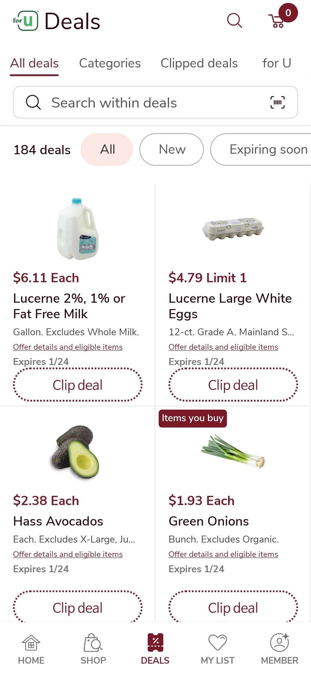 적은 양의 야채나 유제품들은 주로 Safeway를 가요. 처음 방문할 때부터 간단하게 미국 전화번호만 있으면 멤버가입이 가능하니 꼭 가입하세요. 물건마다 멤버가격이 달라 할인을 받을 수 있어요. Safeway 앱을 깔면 여러 할인쿠폰 등을 클립해 놓을 수 있는데 다음에 가게에 가서 물건을 사면 클립해 놓은 쿠폰이 자동 적용되어 할인을 받을 수 있어요. 앱에 DEALS에 들어가면 여러 쿠폰들이 있는데 살만한 물건을 찾은 뒤 Clip deal을 하면 My list에 적립이 돼요. 클립해 놓은 것만 적용되니 가끔 $5할인권이 생기면 꼭 클립해 놓았다가 사용하세요.