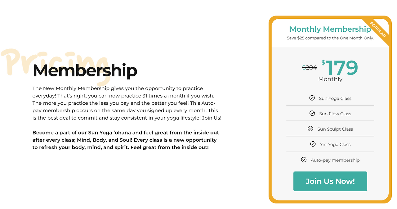 그래서 여기 있을 때 할 수 있는 일들을 찾아 하기로 마음먹고 일단 운동을 시작하기로 했다. 아침에 러닝 하는 사람들도 많지만 나는 누군가가 앞에서 안내해 줘야 동기가 부여되는 스타일이라 운동할 곳을 찾아보기 시작했다. 한국에서 필라테스를 했기에 처음 요가나 필라테스 스튜디오를 알아보았다. 집 근처에 있는 몇몇 요가 중 선생님도 많고 수업선택권이 많은 요가 스튜디오를 온라인으로 먼저 알아보았더니 대체로 가격이 아래와 같이 비슷하였다. 1회에는 $28이고 한 달 멤버십이 20만원정도 조금 넘는데 가격은 한국에서 필라테스 수강료와 비슷하니 이것으로 해야겠다고 생각하고 방문해 보았다.