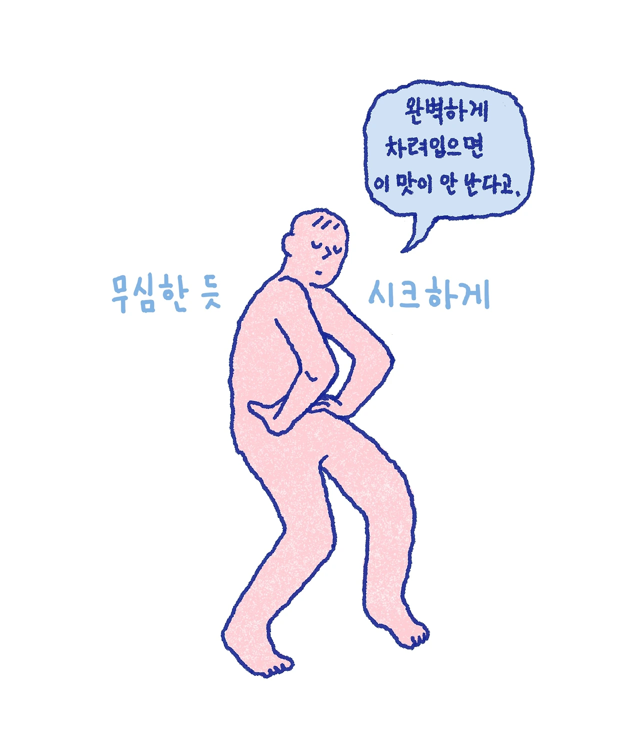 그런데 이런 기술엔 상당한 내공이 필요하다. 자칫 잘못했다간 패션 테러리스트가 되거나 정말 옷차림에 무심한 사람이 될 수 있기 때문이다. 그래서 어느 정도 경지에 오른 고수들이 쓰는 기술이란다.