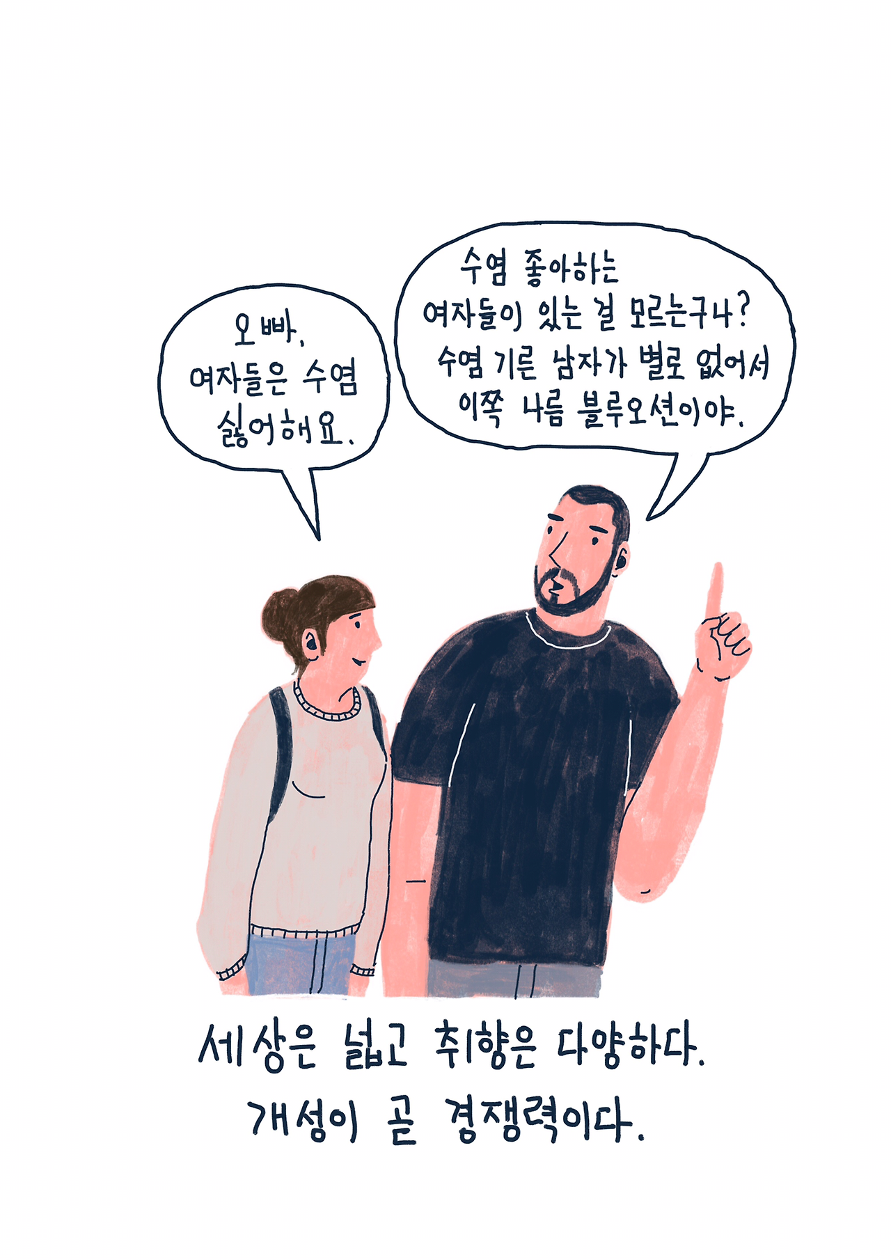 여자들이 좋아한다는 걸 모조리 했는데도 경쟁력이 떨어지는 이유는 모두가 그걸 하고 있기 때문은 아닐까. 사람들의 취향은 다양하고, 수염을 좋아하는 여자들도 있다는 사실을 우리는 왜 간과한 것일까. 다수가 아니라서? 수염은 안티(anti)가 많은 대신 경쟁자는 적은 블루오션이다. 우리는 왜 소수의 취향을 왜 무시했단 말인가. 우리는 왜 안티를 두려워하는가.