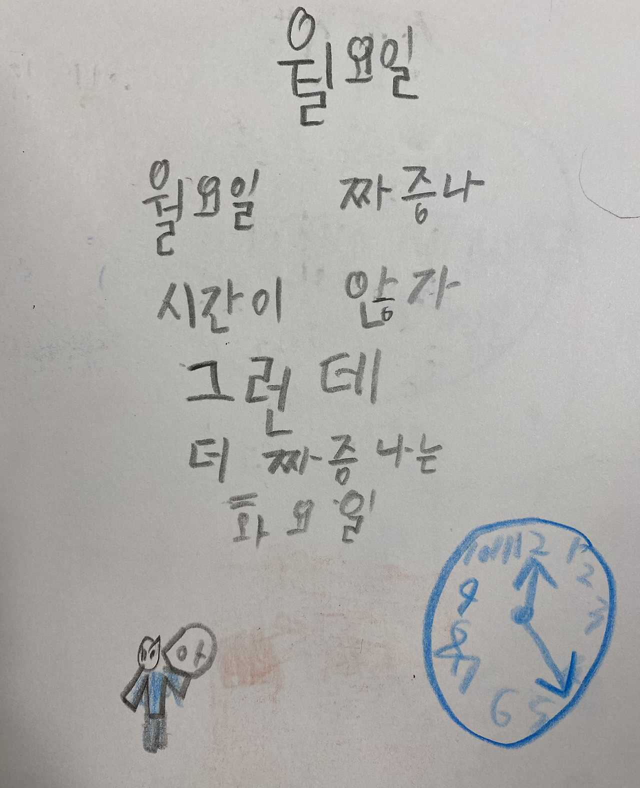 월요일의 12시 23분쯤을 그려 넣은 시계 그림은 학교 하교 시간인 12시 30분까지 정말 더디게 가는 것을 표현했다.