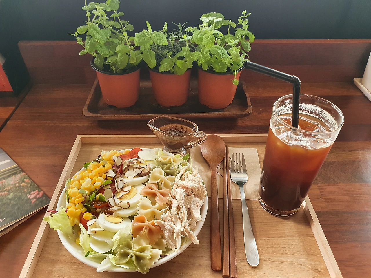 "사장님이세요?"라고 물으니 작가님이 한눈에 알아봐 주셨다. 긴장한 탓에 눈도 잘 못 마주치고 횡설수설하며 QR체크인을 하고 파스타 샐러드와 아이스 아메리카노를 주문했다. 창가 쪽에 자리를 잡고 책을 읽다 가야겠다고 생각했기에 책도 한 권 골랐다.