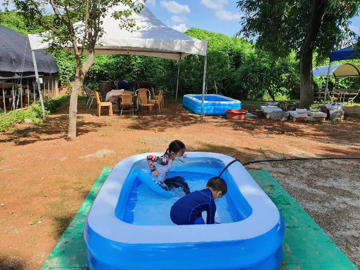 첫째의 여름방학이 얼마 남지 않았고 올여름 수영복 한 번 입어보지 못한 아이들을 데리고 가보고 싶은 곳이 있었다. 내가 살고 있는 지역에 위치한 농장이었다. 2천 평 규모의 농장에서 모래놀이, 물놀이, 만들기 체험 등을 할 수 있고 정부 지침에 따른 입장 가능한 인원보다 훨씬 못 미치는 소수의 인원만 예약제로 운영하고 있어 충분한 거리두기가 가능하다고 소개하고 있었다. 쓰레기는 되가져가는 조건으로 음식물 반입도 가능하고 외할머니 집에 놀러 다녀온 것 같다는 리뷰까지 보고는 개학하기 전에 꼭 한 번 다녀와야겠다고 마음먹은 곳이었다. 일기예보를 확인하고 예약한 뒤 물놀이, 물총놀이에 필요한 준비물과 보냉 가방에 넣어갈 과일과 음료를 챙겨 놓았다.
