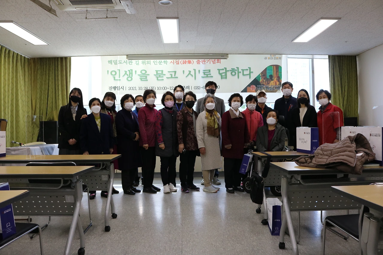 집 앞 도서관에서 6월부터 시작되었던 시(詩) 창작 수업이 끝났다. 거리두기 4단계 이후 비대면으로 수업을 듣다가 시월의 마지막 목요일 출판기념회가 있어 오랜만에 도서관 강당으로 향했다. 그간 뵙지 못했던 사서 선생님과 어르신들, 두 번째 강사로 활약해 주신 이병일 작가님을 뵈니 반가움에 기분이 들떴다. 겉으로 표현은 전혀 못했지만 말이다.