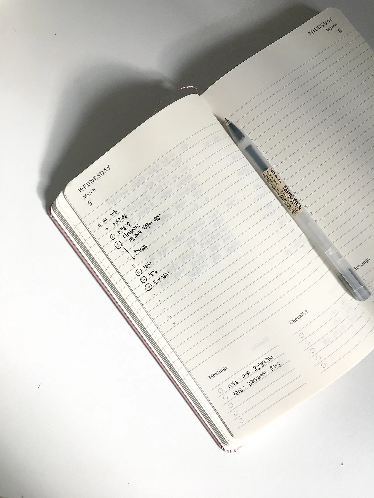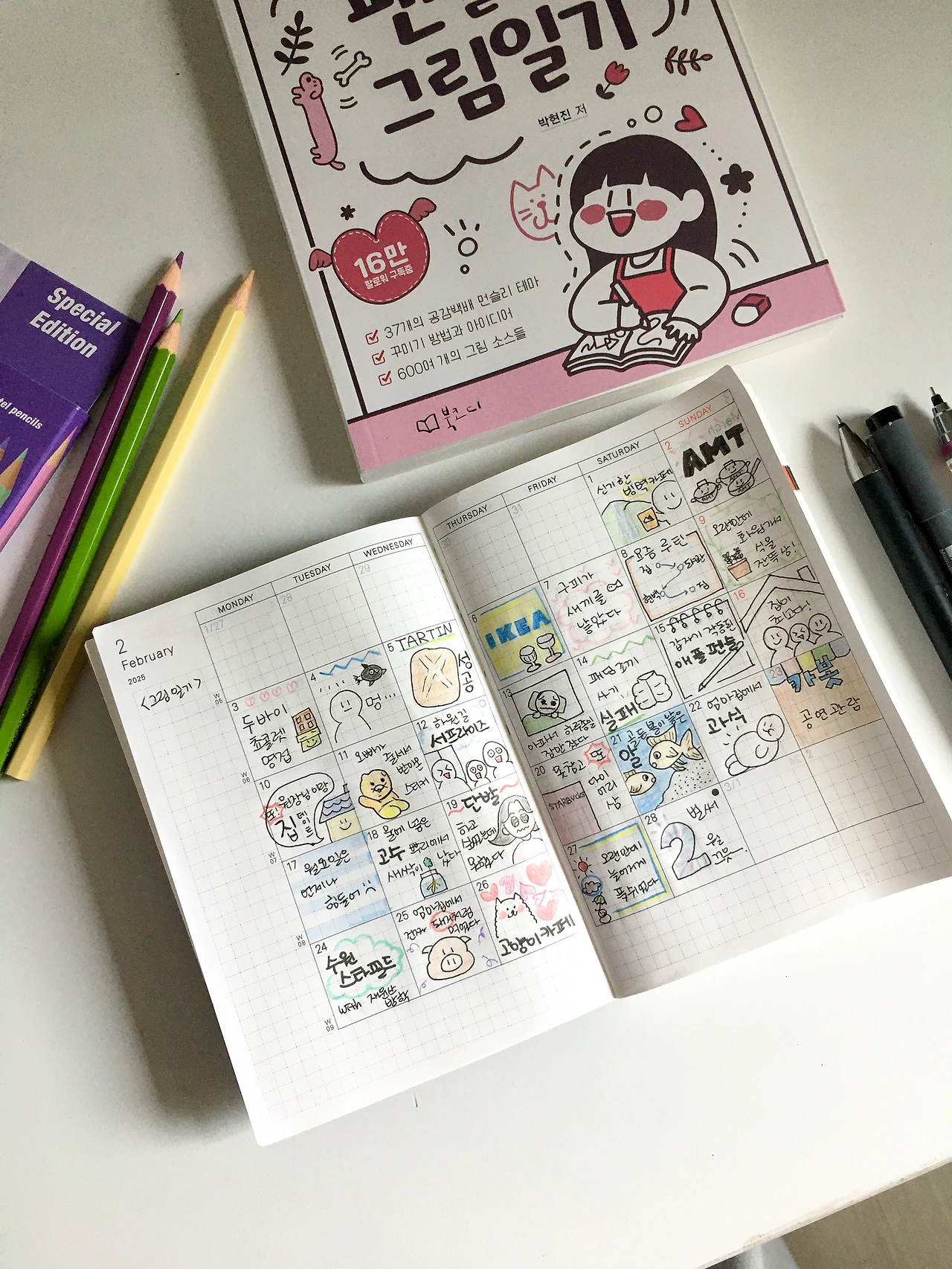처음에는 다꾸를 하면서 '귀엽게', '예쁘게'에 더 중점을 두고 기록을 하기 시작했던 것 같다. 꾸미는 재미에 더 잘 써 내려가고 평범했던 날이었는데 하루하루가 더 특별한 시간이 되어 갔다. 그러다 2월 중순쯤 자꾸 스타벅스 핑크색 다이어리가 눈에 아른 거렸다. 작년 말 스타벅스에서 프리퀀시를 모아 다이어리를 받을 수 있었을 때에는 관심도 없다가 갑자기 눈에 들어와 버렸었다. 한참을 고민하다가 당근에서 9,000원에 올라온 새 스타벅스 다이어리를 구매했다. 아무래도 2월이 거의 끝나가는 시점이라 가격을 많이 내려서 판매하셨던 것 같다. 받고 보니 너무 마음에 들었다! 그리고 그 다이어리가 지금 주 다이어리가 되었다.
