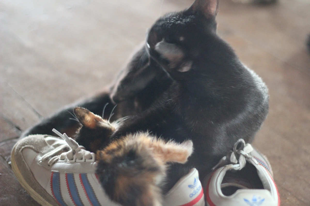 또 왜 하필 신발 위인가.. 깨끗하지는 않을 텐데 염려하면서요. 시간이 지나도 신발에서 내려올 생각은 않고 심지어 새끼 고양이는 신발 안으로 들어가고 어미도 신발에 몸을 비비는 광경을 보고는 고양이가 좋아하는 냄새라도 있는 건가 싶었습니다. 건기에서 최고조에 이른, 미얀마 신년 직전의 무더운 어느 날이었거든요. 어쨌거나 환영받는 느낌에 기분은 특별했습니다.