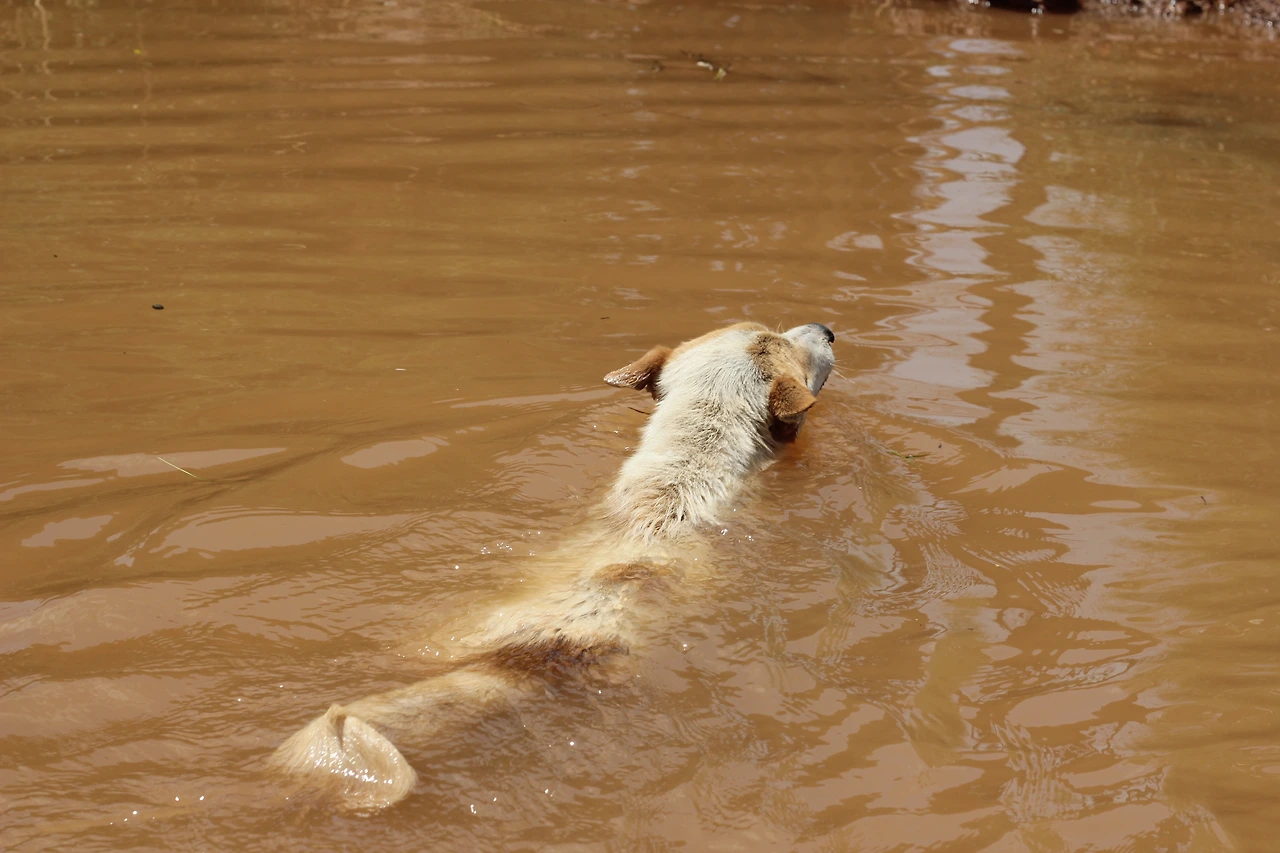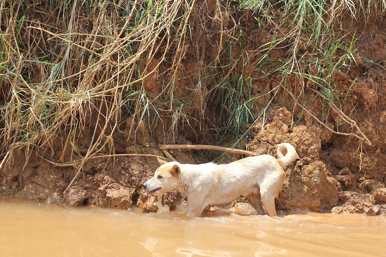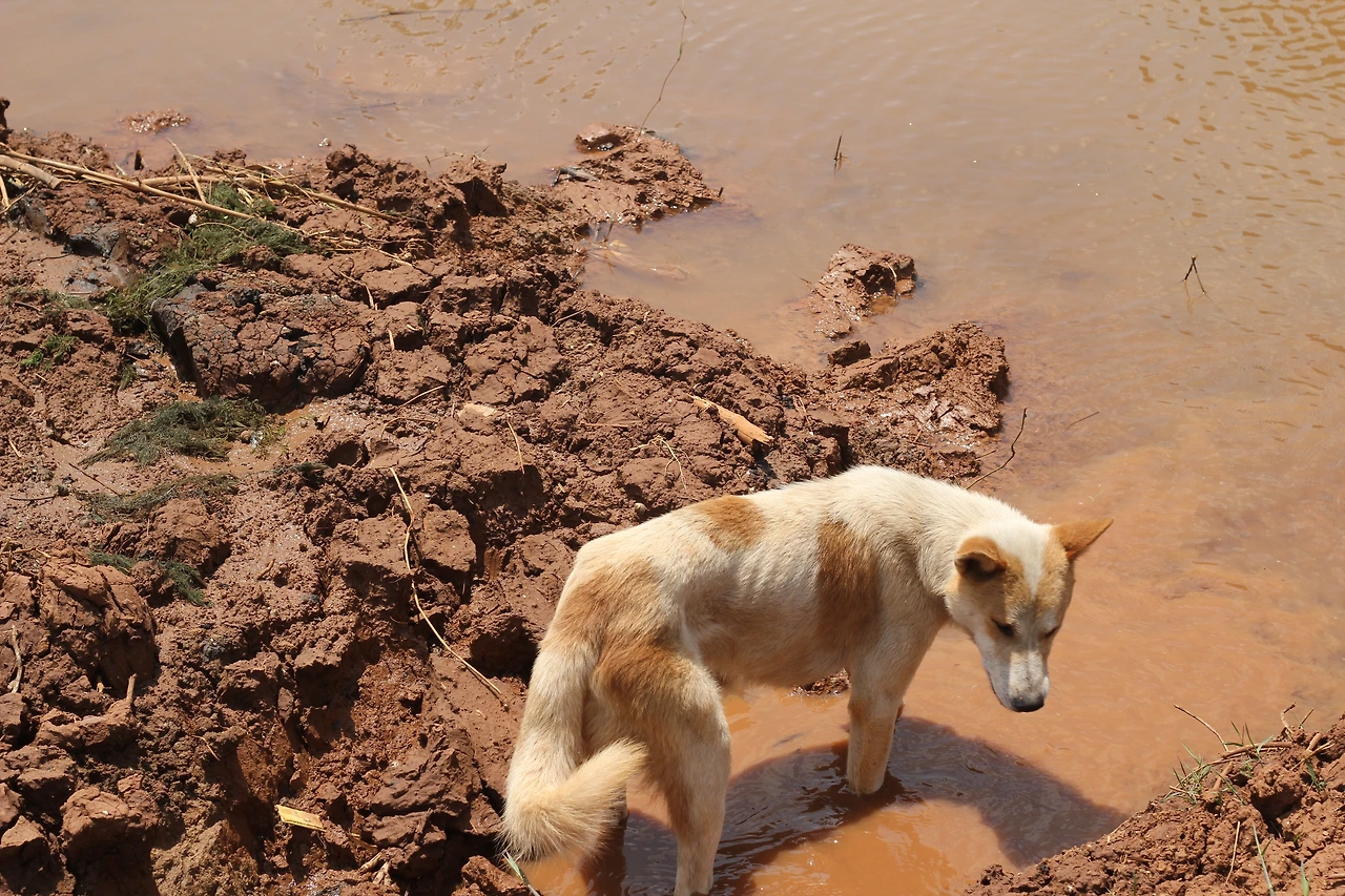 이제 보트가 정박한 곳에 도착했을 무렵, 길이 22km 폭 11km인 거의 바다와 같이 끝없이 펼쳐진 인레 호수의 시작 지점에서는 육지의 끝과도 같은 느낌이어서 ‘이제는 갈 곳으로 돌아가겠지.’ 싶었으나 미얀마의 개는 여기서 멈출 줄을 몰랐습니다. 진흙 속에 발을 빠뜨리는 것도 주저하지 않았습니다. 이렇게 진흙탕인 물에서 주저앉아 버리니 ‘아 더워서 호수로 수영을 나가려던 거였나?’ 싶었습니다. 미얀마는 4월 초, 건기의 최고점이라 날이 매우 더웠거든요.