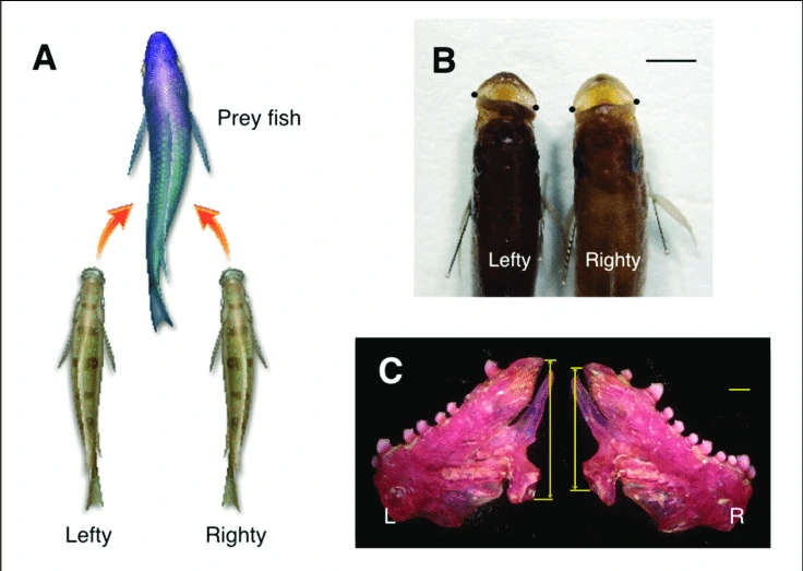 그림 2. 시클리드라는 물고기는 성장하며 한 쪽을 선호하는 특이성을 보인다. 자세한 내용은 Takeuchi, Plos one, 2016 참고.
