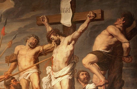 그림 4. 예수의 처형. 예수 오른쪽의 죄수는 뉘우쳤고, 성인으로 추앙받는 반면(Saint. Dismas) 우측의 죄수는 그렇지 않다. 예수의 십자가에는 INRI 가 적혀 있다⁵.