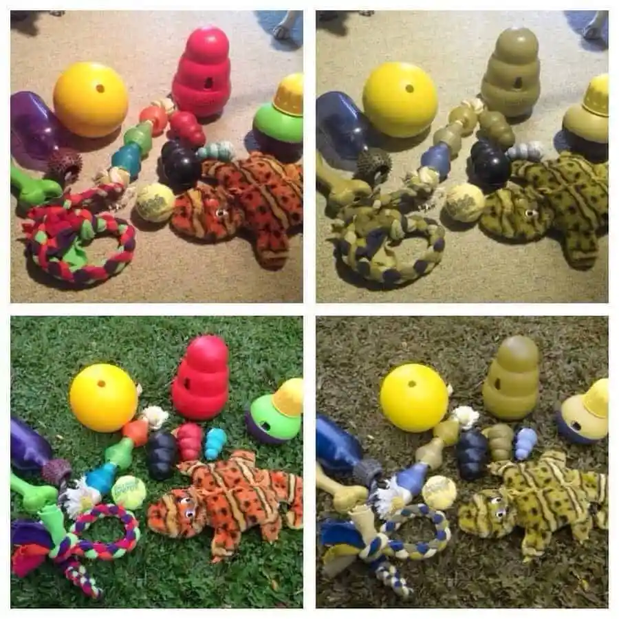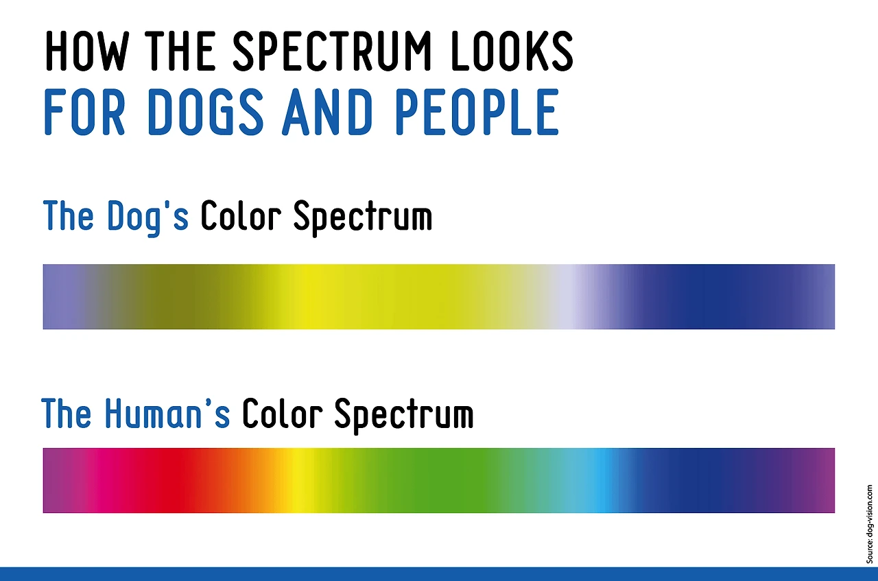 그림 6. 개나 고양이 같은 다른 포유류들은 인간으로 치면 적록 색맹인 셈이다. 이들은 광수용체의 차이로 붉은색과 녹색을 명확히 구분하기 어렵다⁷.