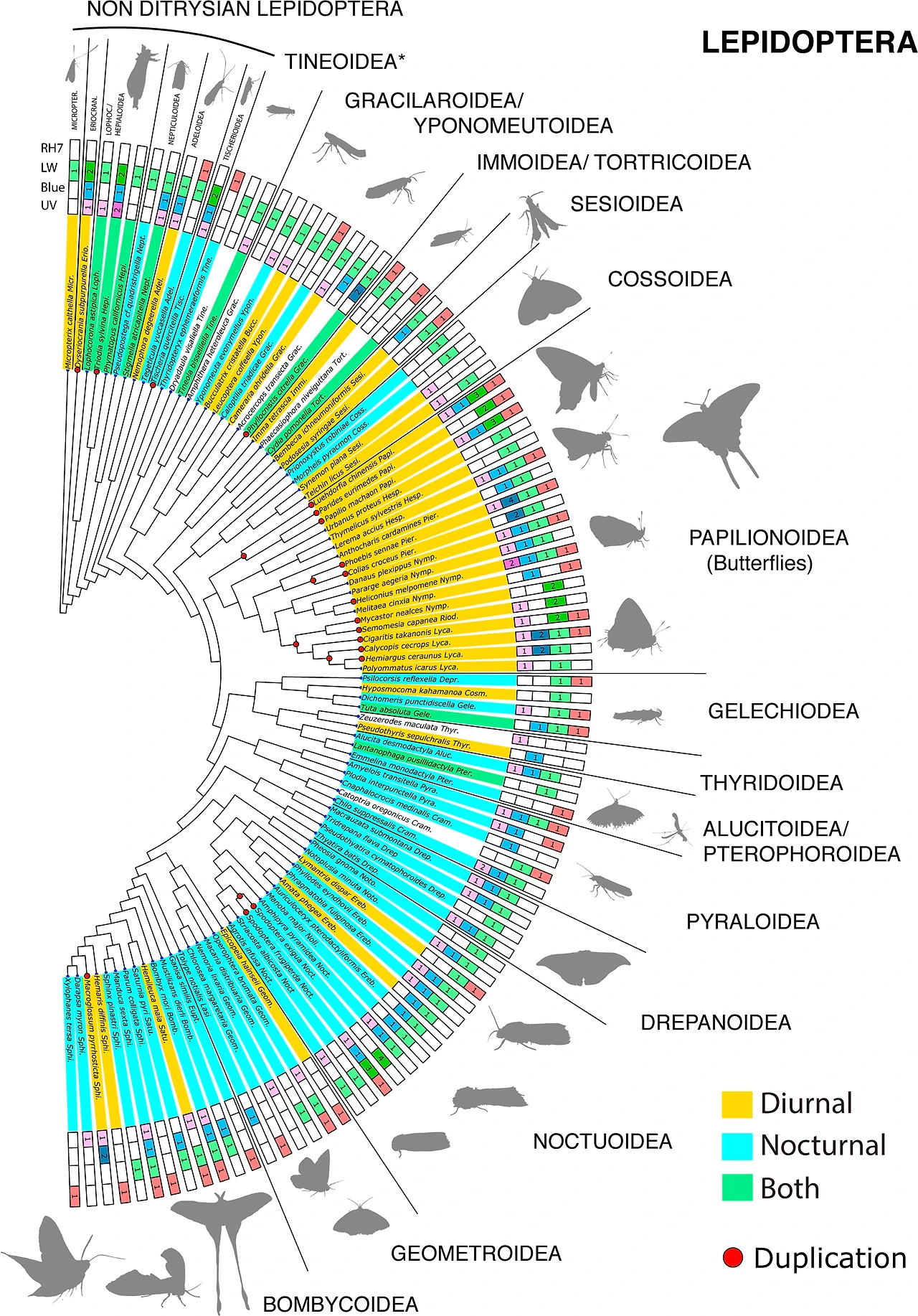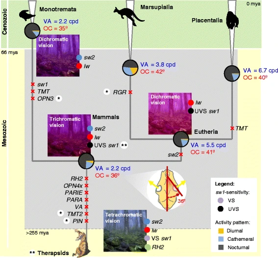 그러나 사실, 포유류 중에서는 인간(을 비롯한 영장류) 가 독특한 편에 속한다. 대부분의 포유류는 시각이 그렇게 좋지 않고, 특히나 색각이 뛰어나지 않다. 이것은 포유류가 중생대에 수궁류로 갈라진 이후, 공룡들과 함께 살아가던 작은 야행성 동물들로부터 진화해왔기 때문이다(사실, 아직도 포유류의 65% 가량은 야행성이다,(그림 5)).