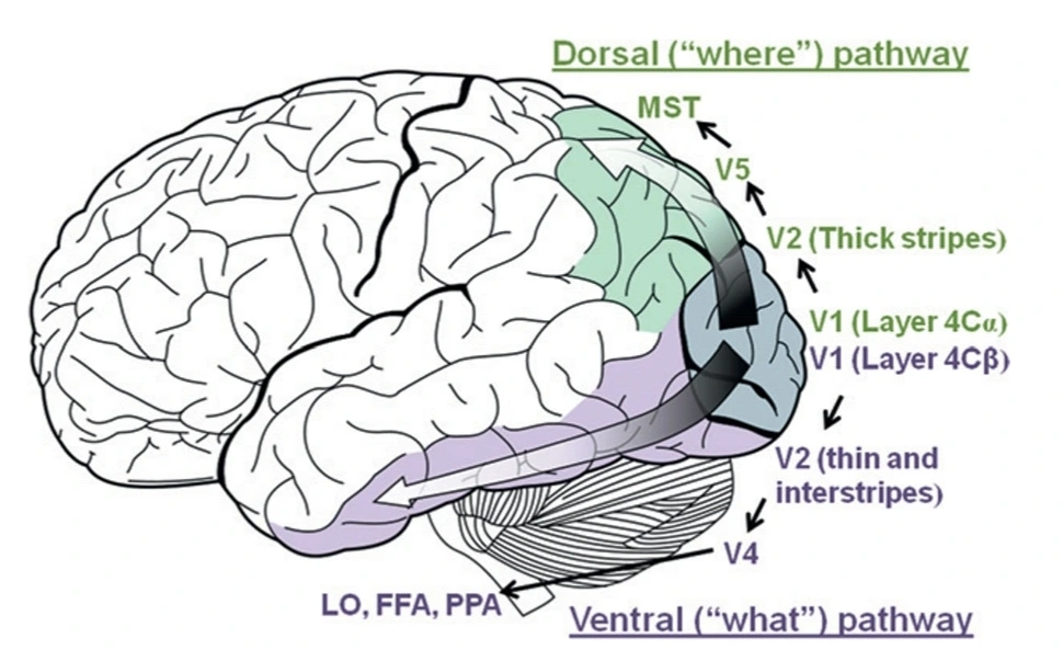 그림 2. 시각 피질은 두 가지 경로를 통해 시각 정보를 처리한다고 알려져 있다. 아래쪽은 물체가 무엇인지를 파악하고, 윗쪽은 물체의 위치나 이동에 대해 파악한다.