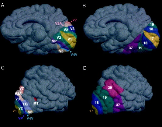 그림 3. 인간의 시각 피질. 후두엽에 위치하는 시각 피질은 전체 피질 면적 중 넓은 영역을 차지하고 있다.